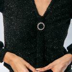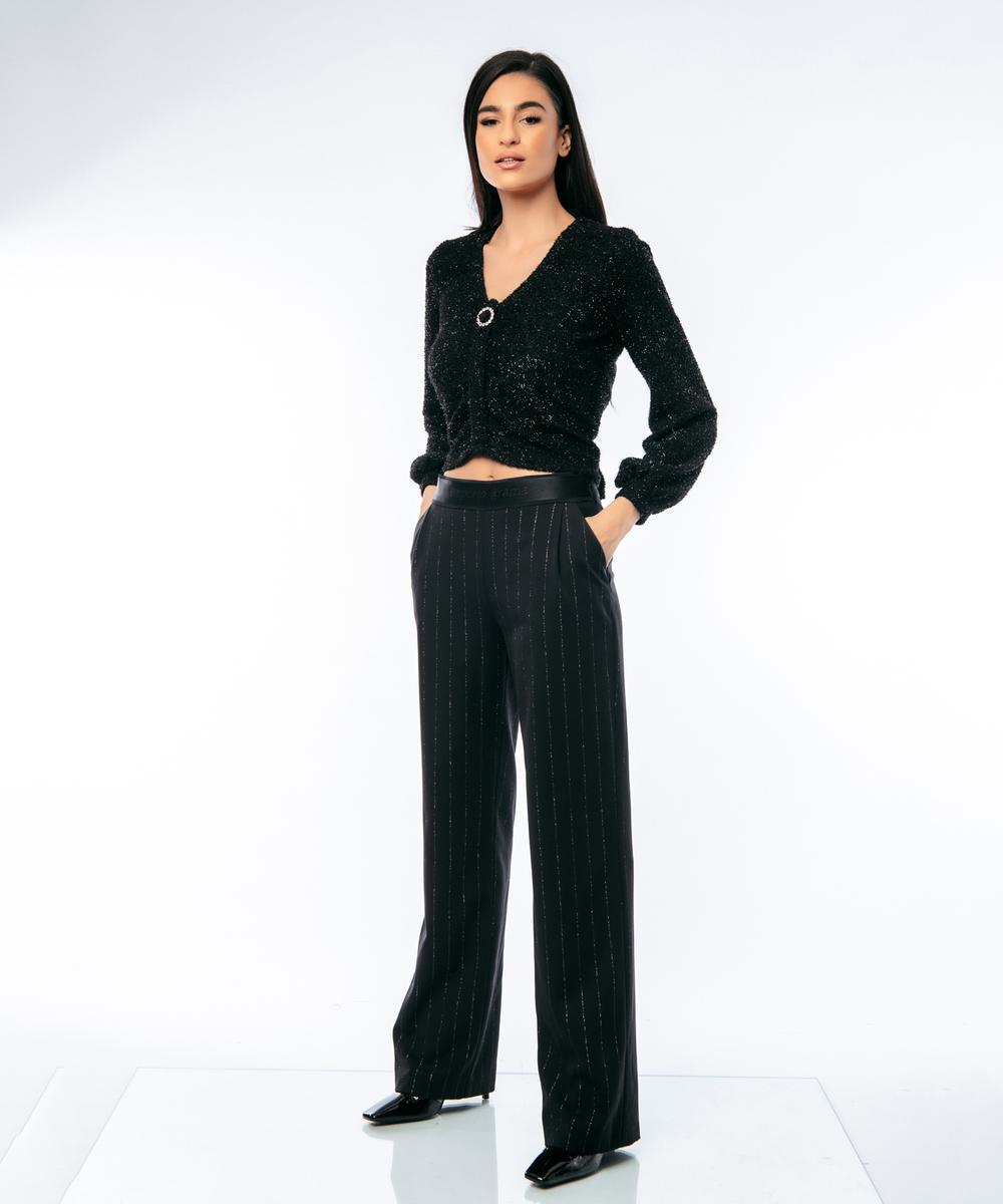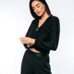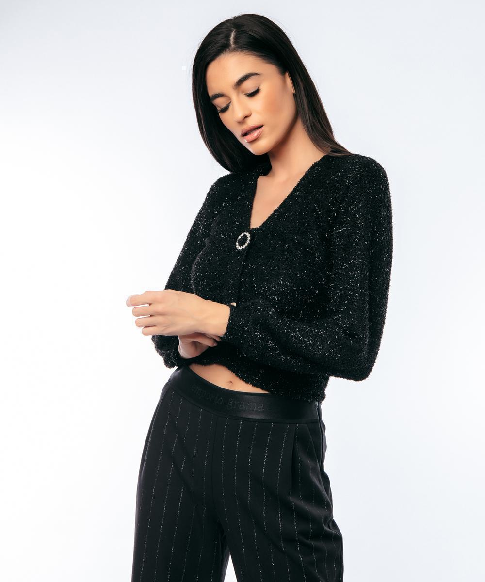 Μπλούζα πλεκτής ύφανσης με lurex , V λαιμόκοψη ,μακρυμάνικη με διακοσμητική λεπτομέρεια εμπρός.YΨΟΣ ΜΟΝΤΕΛΟΥ: 1.75cm.ΤΟ ΜΟΝΤΕΛΟ ΦΟΡΑΕΙ:XS