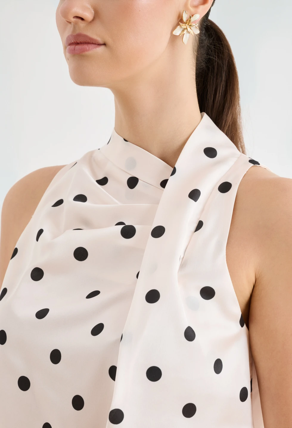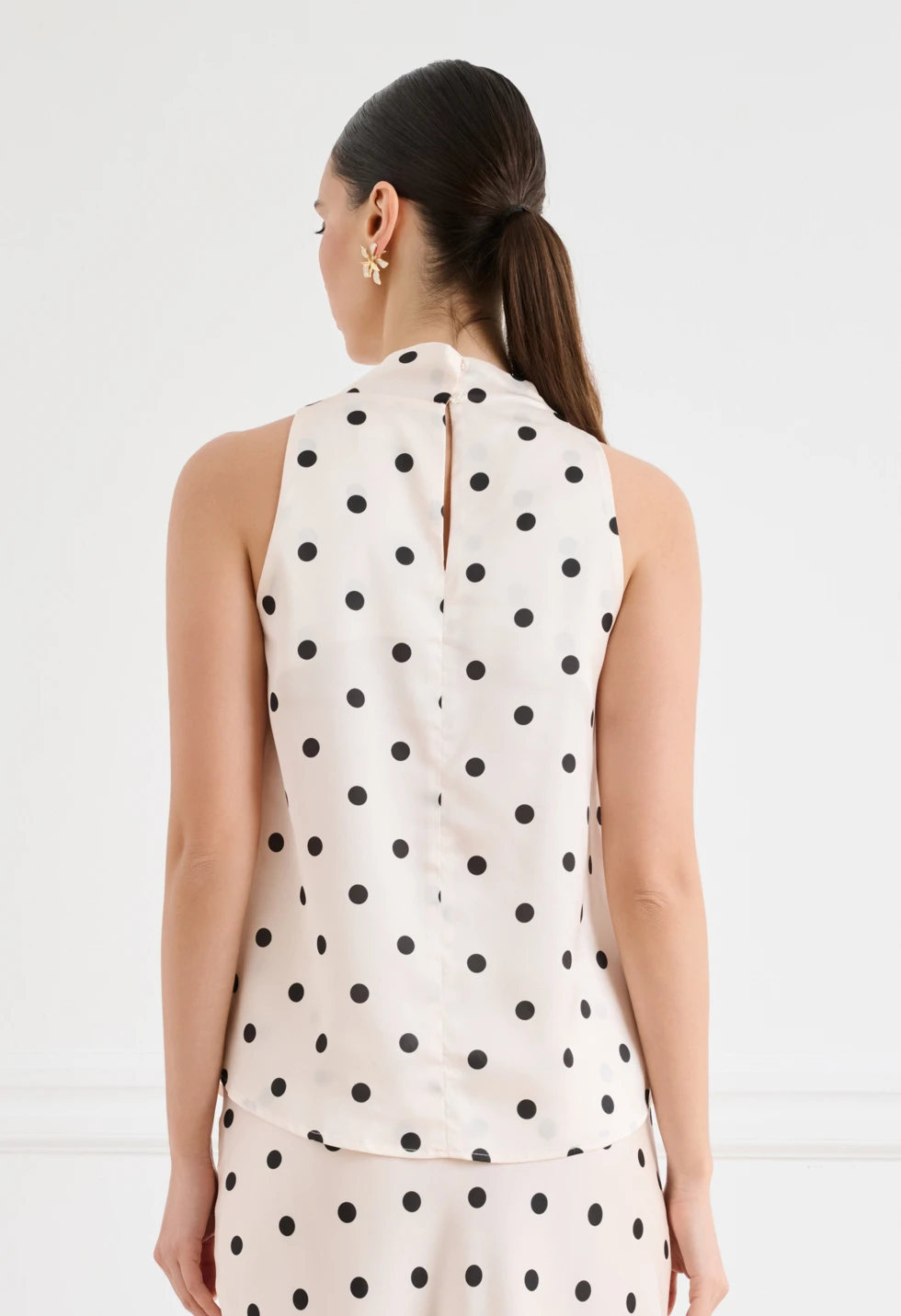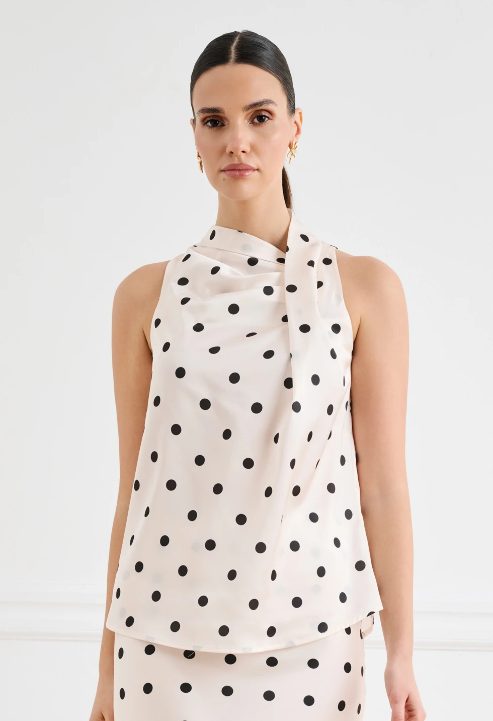 Κομψό γυναικείο σατινέ πουά τοπ σε off-white απόχρωση με μαύρες λεπτομέρειες, ιδανικό για chic εμφανίσεις. Διαθέτει αμάνικο σχέδιο με ψηλό λαιμό/halter λαιμόκοψη και διακριτικό ασύμμετρο draped τελείωμα που χαρίζει elegant κίνηση. Η εφαρμογή είναι άνετη και κολακευτική, ενώ το τοπ συνδυάζεται εύκολα με φούστα ή παντελόνι για office look, βραδινό outfit ή πιο επίσημες περιστάσεις.