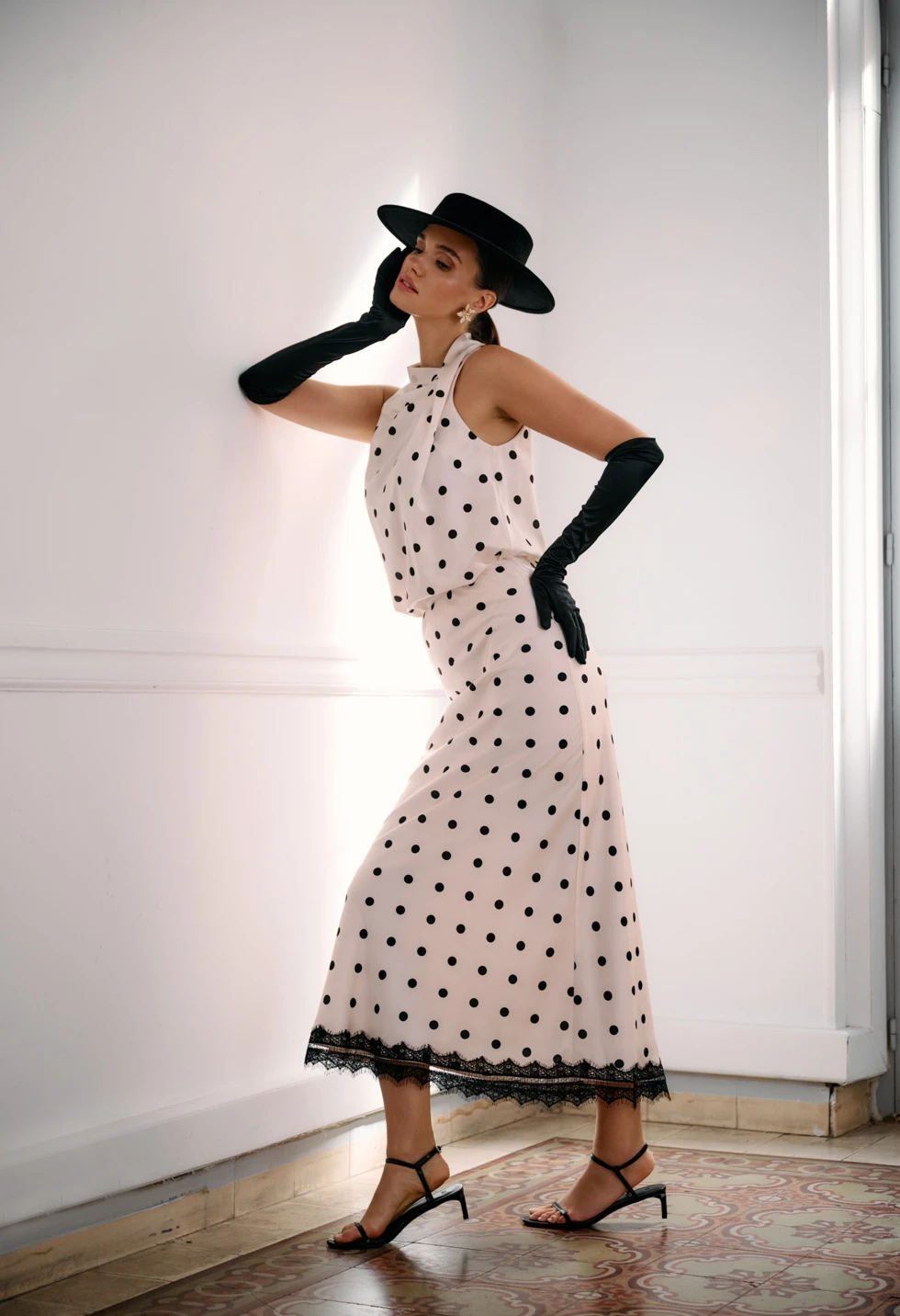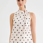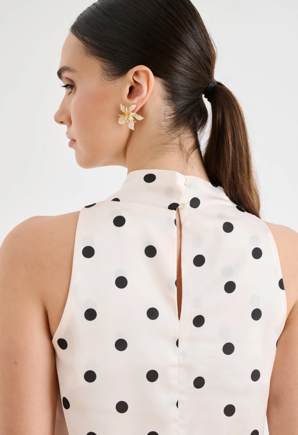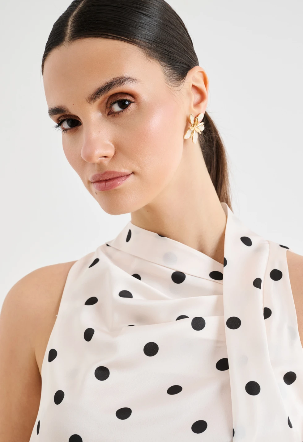 Κομψό γυναικείο σατινέ πουά τοπ σε off-white απόχρωση με μαύρες λεπτομέρειες, ιδανικό για chic εμφανίσεις. Διαθέτει αμάνικο σχέδιο με ψηλό λαιμό/halter λαιμόκοψη και διακριτικό ασύμμετρο draped τελείωμα που χαρίζει elegant κίνηση. Η εφαρμογή είναι άνετη και κολακευτική, ενώ το τοπ συνδυάζεται εύκολα με φούστα ή παντελόνι για office look, βραδινό outfit ή πιο επίσημες περιστάσεις.