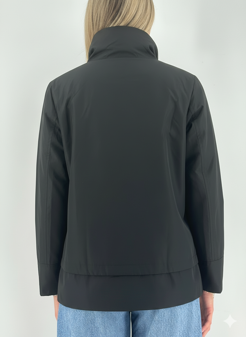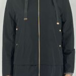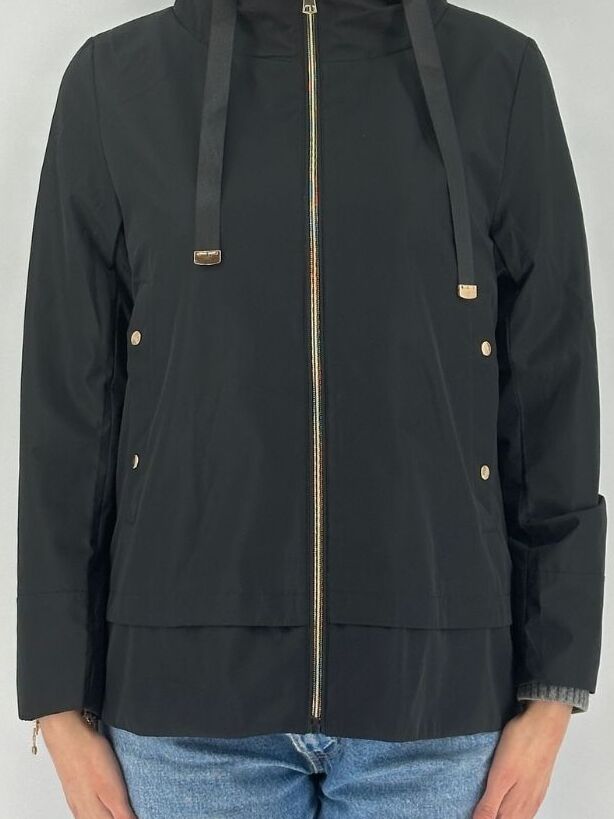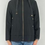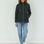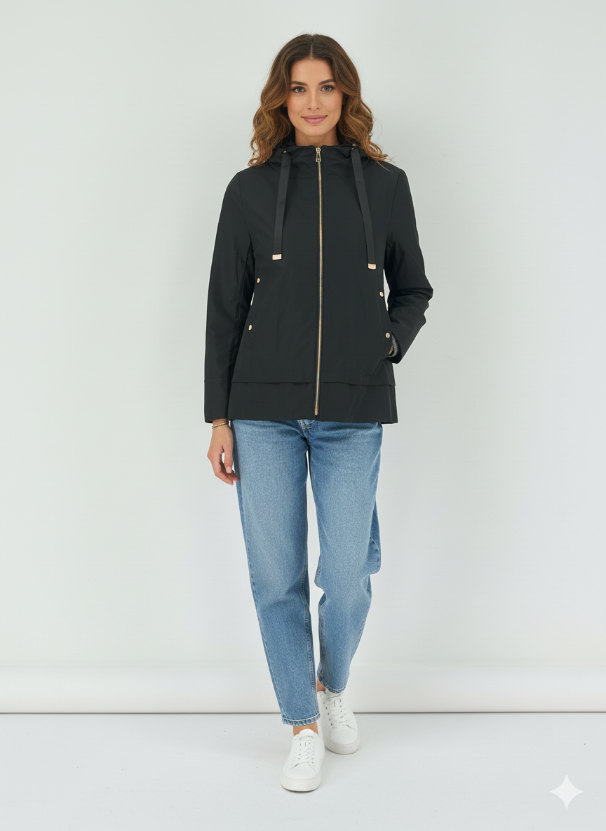 Μπουφάν μαύρο, το ιδανικό πανωφόρι για τις μεταβατικές εποχές. πρόκειται για ένα ελαφρύ αντιανεμικό τζάκετ που ξεχωρίζει χάρη στις λαμπερές χρυσές λεπτομέρειες στο φερμουάρ, τα κουμπιά και τα ακροδέκτη των κορδονιών, που προσθέτουν μια chic πινελιά.