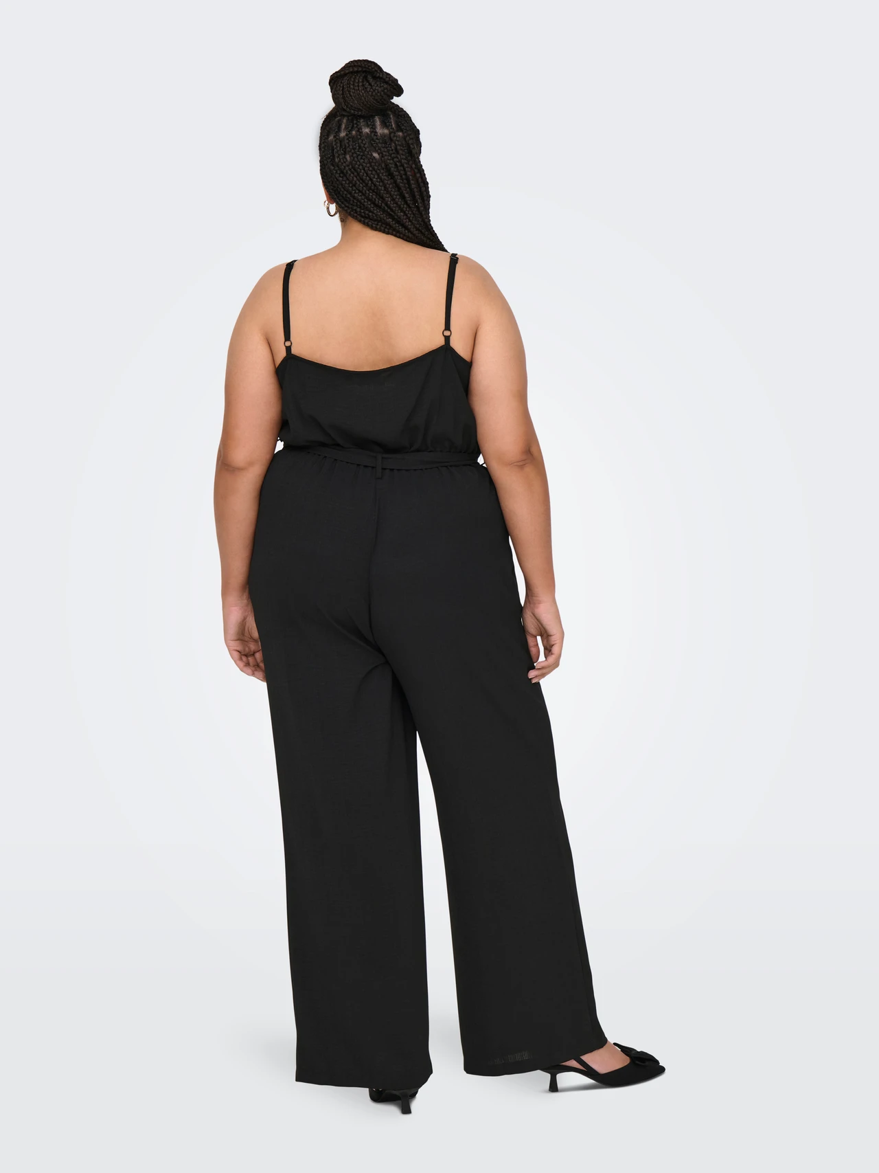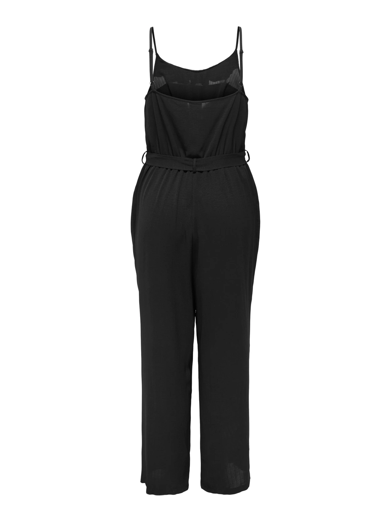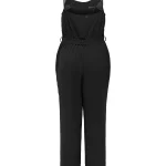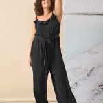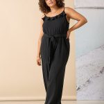 Ολόσωμη φόρμα με τιράντα σε μαύρο χρώμα. Έχει στρογγυλή λαιμόκοψη με βολάν, ρυθμιζόμενες τιράντες και self-tie με λάστιχο ζώνη στη μέση. Η εφαρμογή της είναι κανονική, η γραμμή της είναι μεσάτη και το ύφασμα σταθερό με λάστιχο στη μέση.