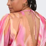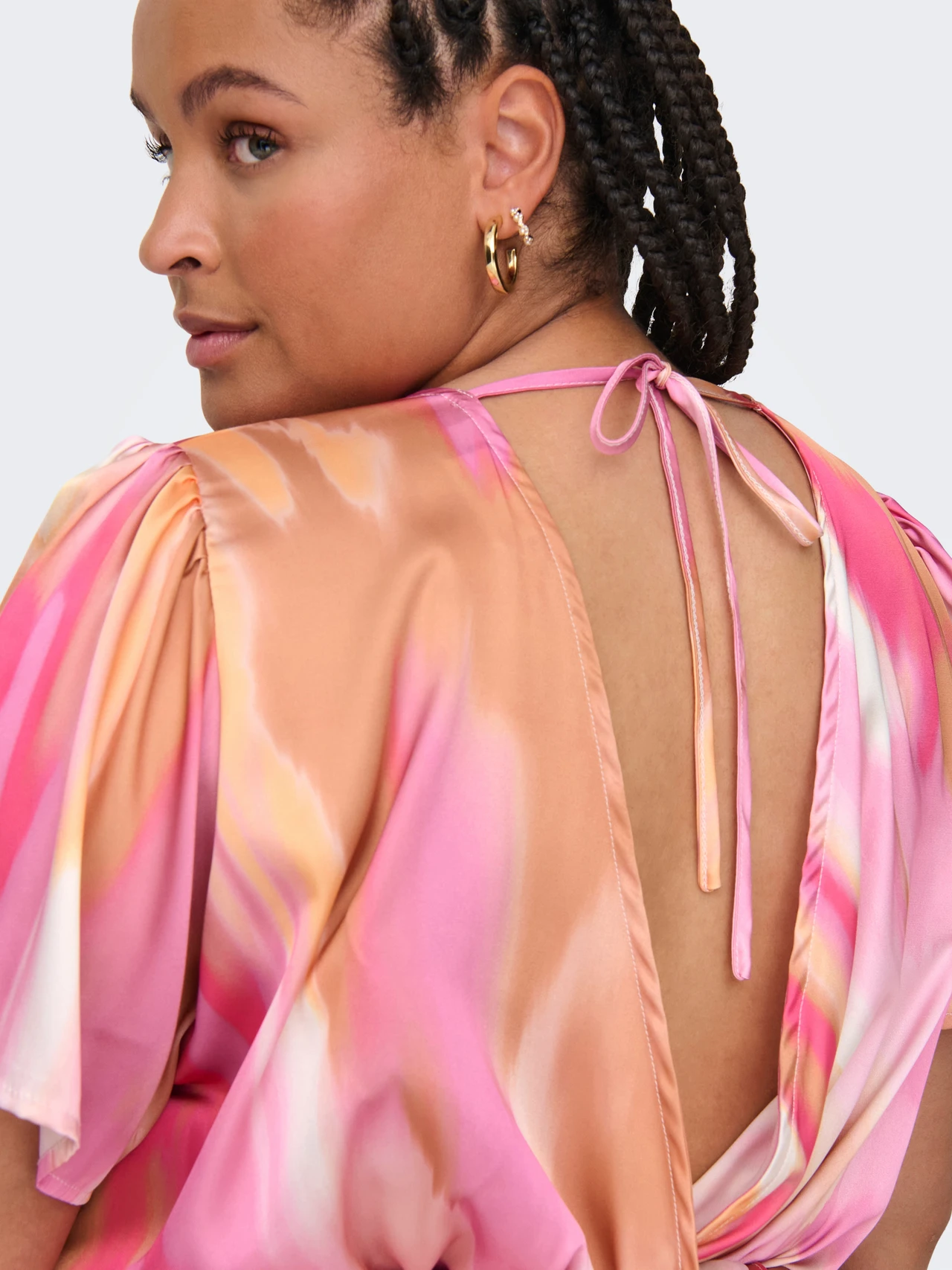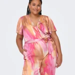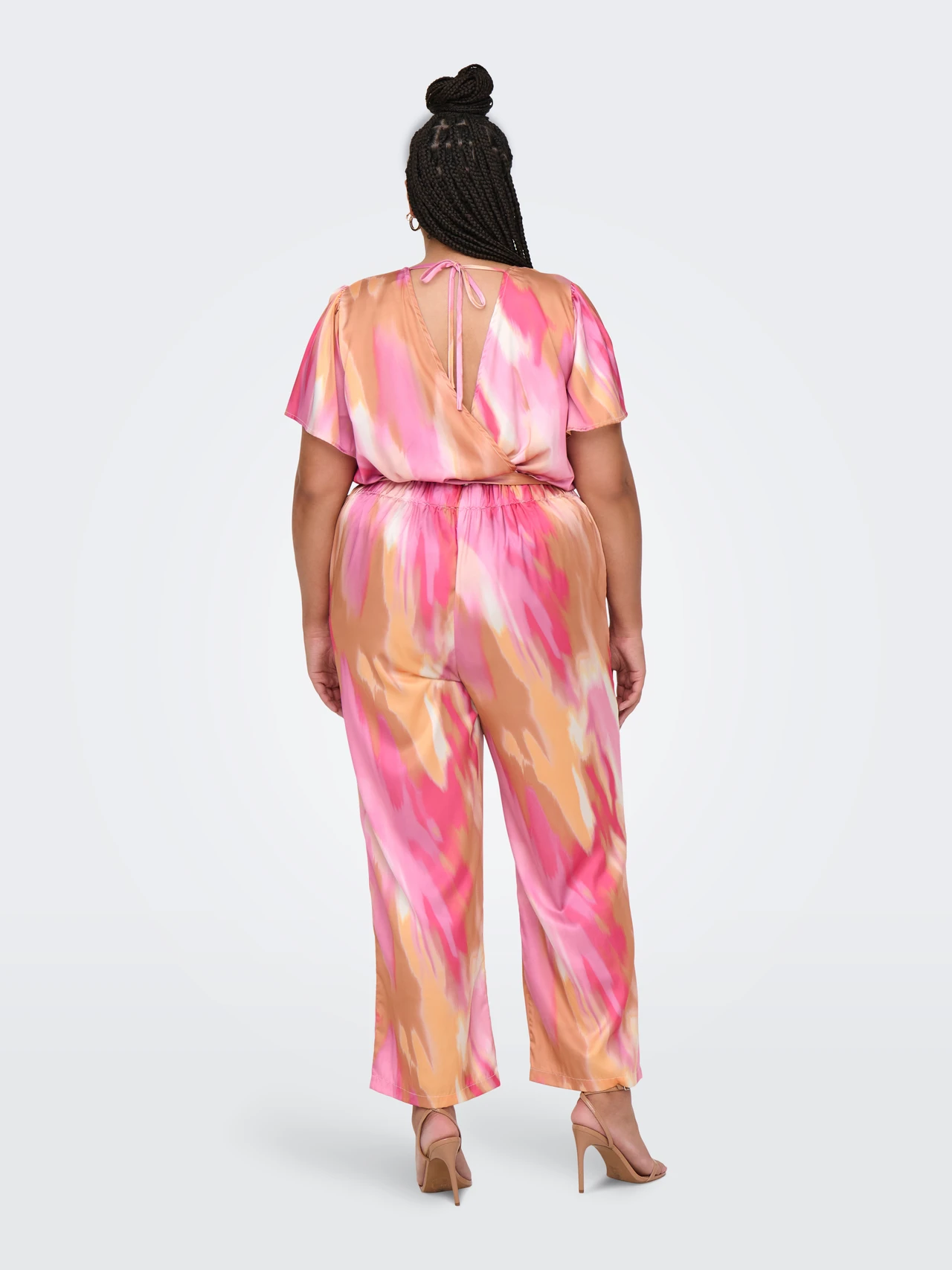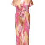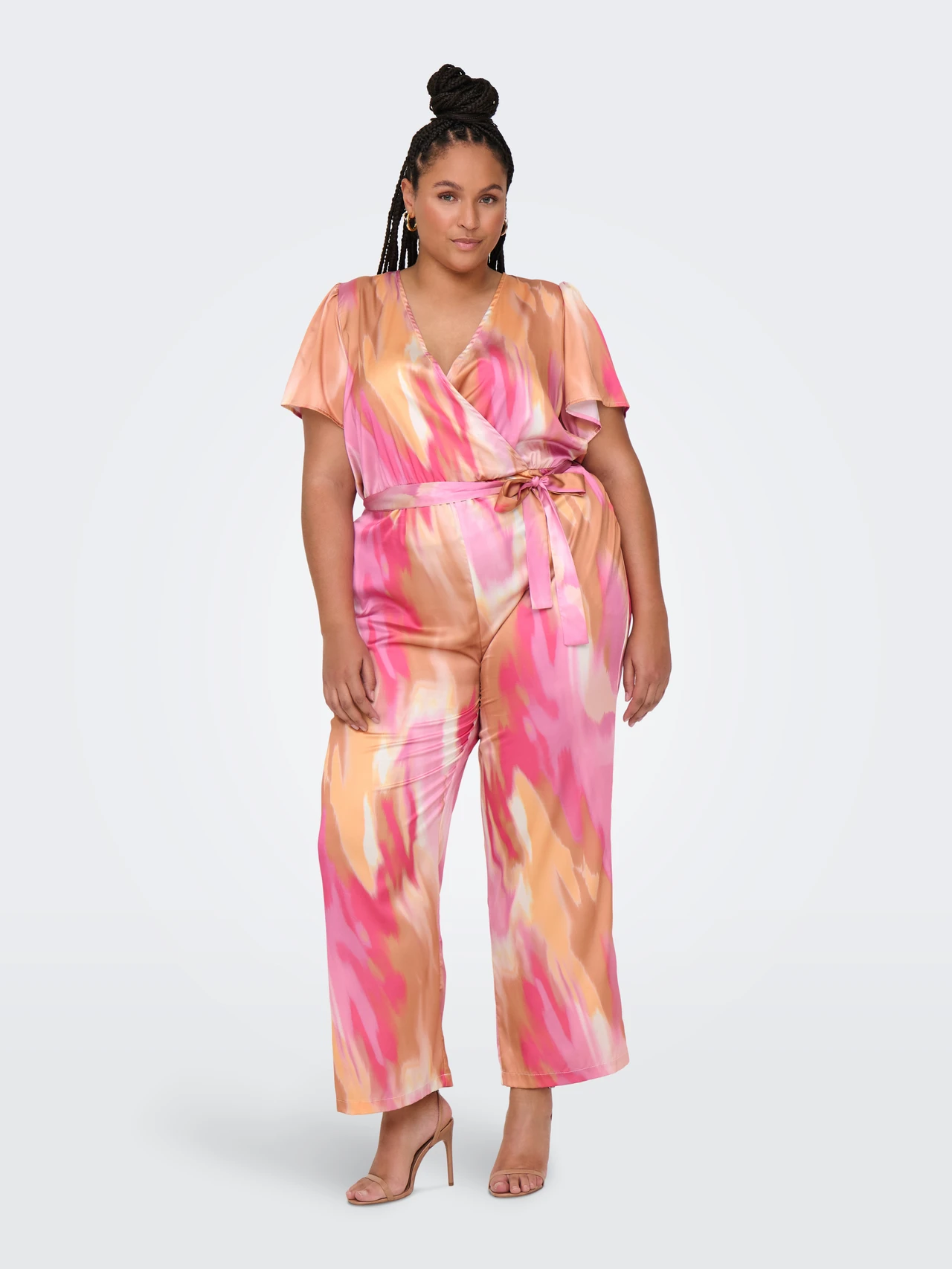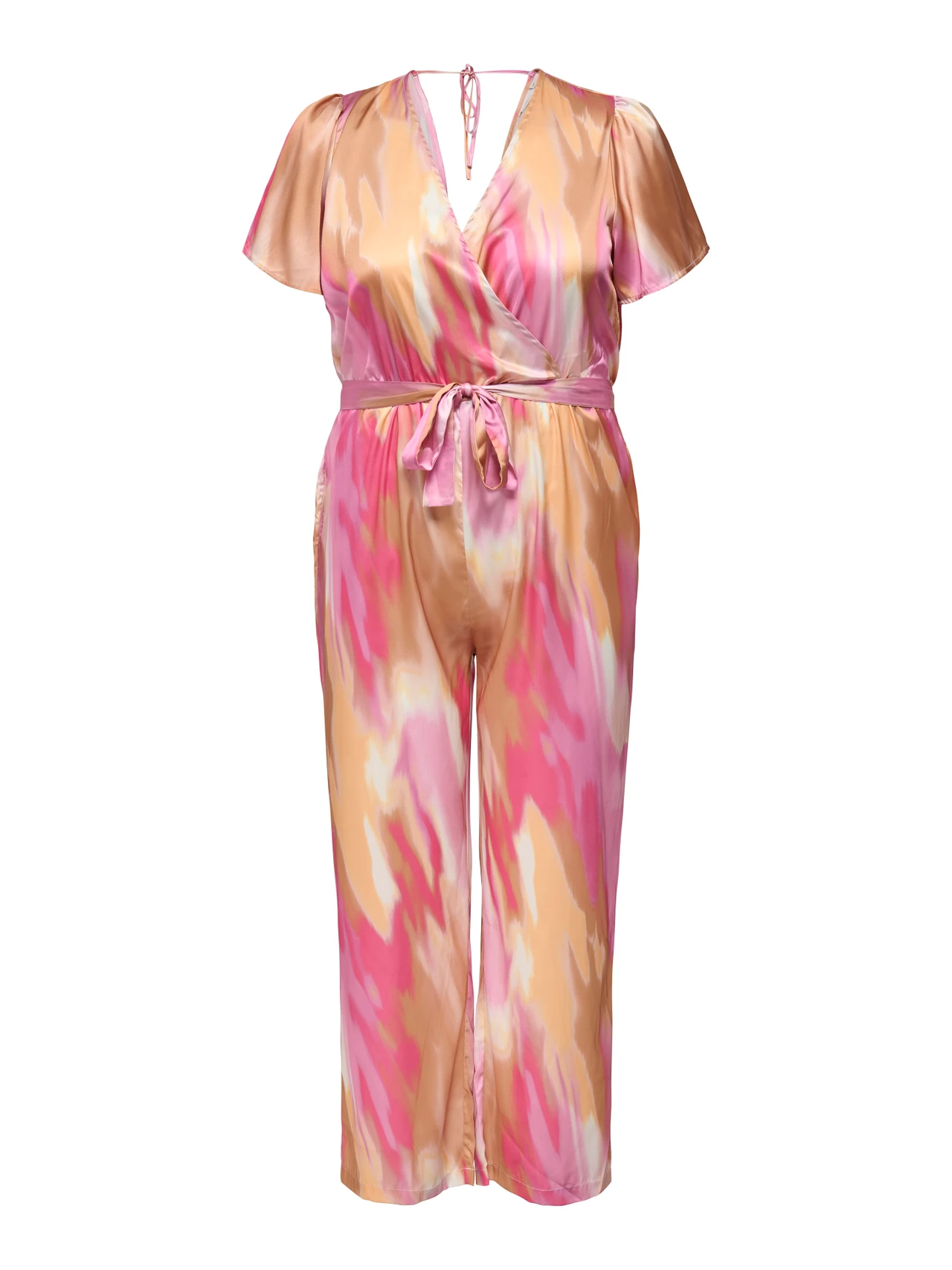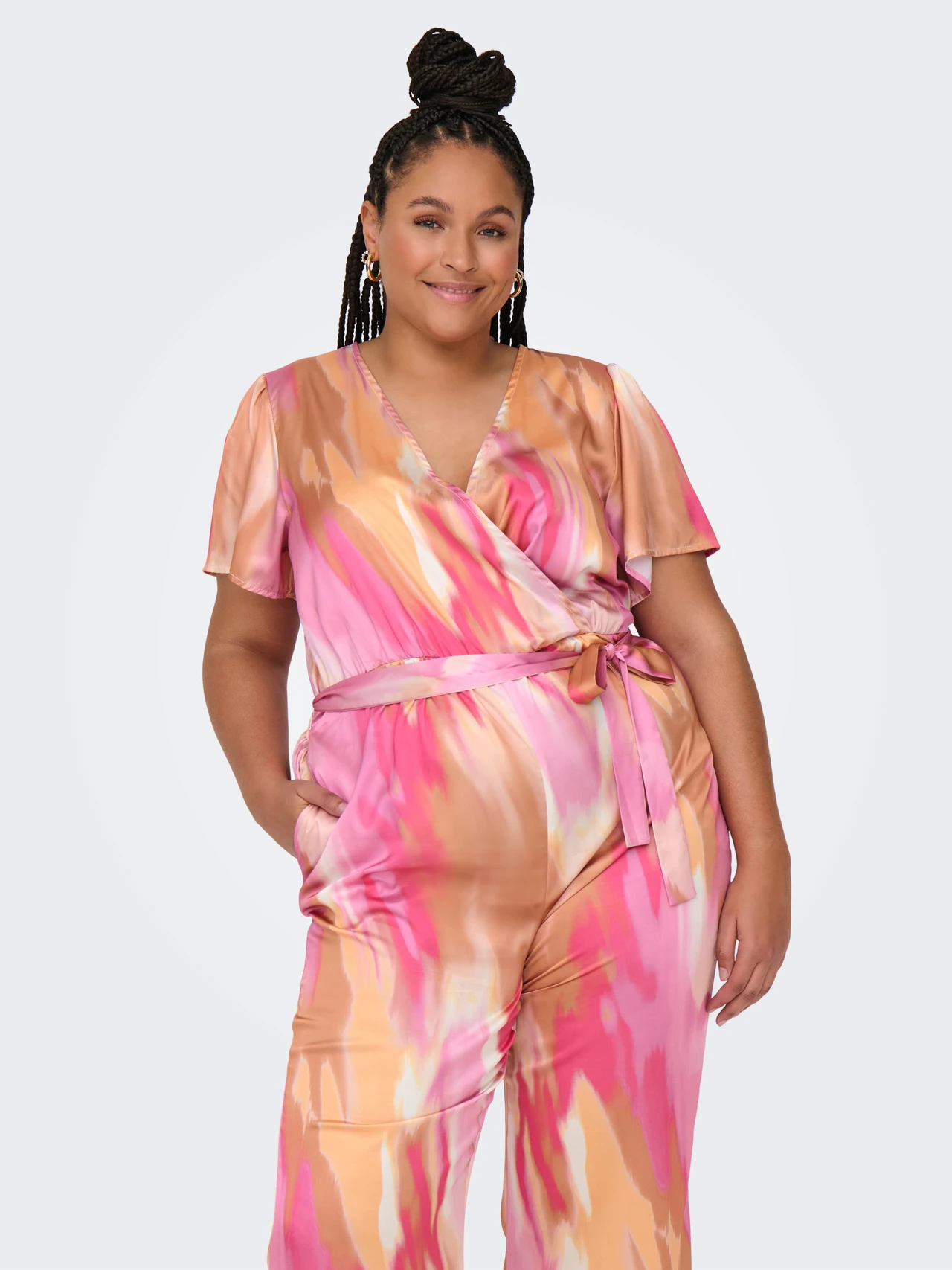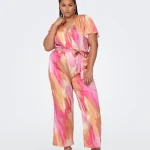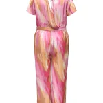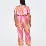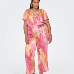 Plus size ολόσωμη φόρμα με ζωηρόχρωμο εμπριμέ σχέδιο σε αποχρώσεις του ροζ, μωβ, πορτοκαλί και μπεζ. Κρουαζέ ντεκολτέ, κοντά μανίκια και ζώνη στη μέση που τονίζει τη σιλουέτα. Άνετη εφαρμογή με ίσιο παντελόνι, ιδανική για ιδιαίτερες εμφανίσεις με στυλ και άνεση.