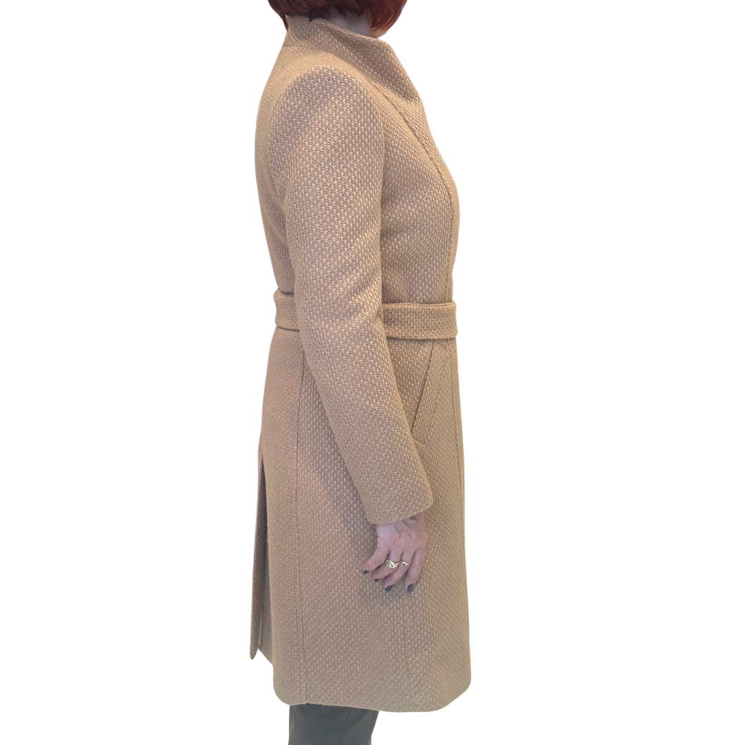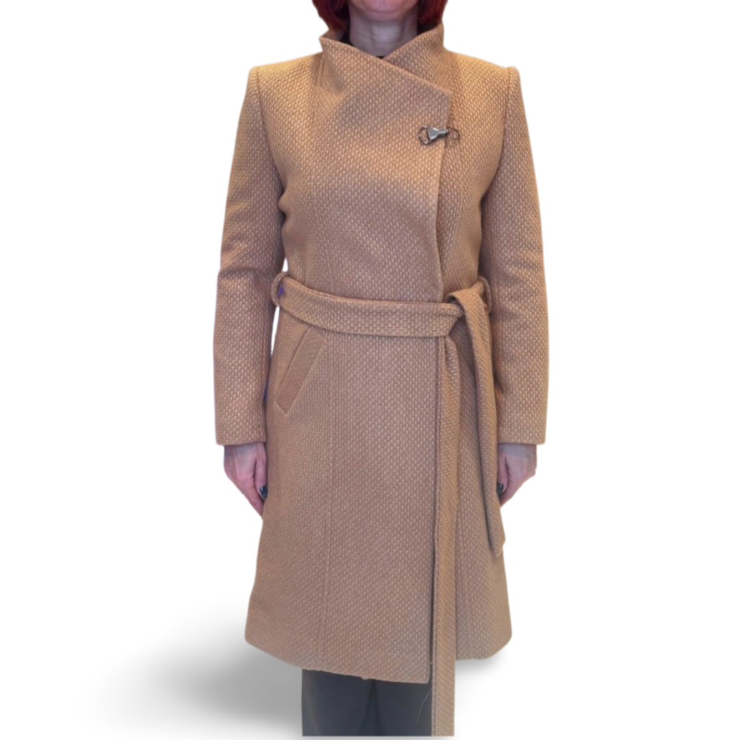 Παλτό με ψηλό γιακά και μακρύ μανίκι. Ρυθμιζόμενη ζώνη από την ίδια ύφανση. Κλείσιμο μπροστινό μέρος με αγκράφα και κρυφό κούμπωμα.
