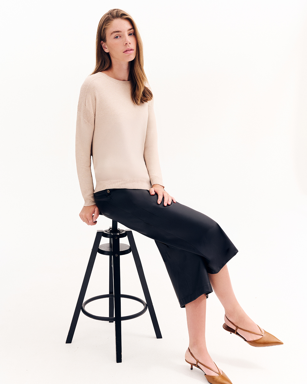 Παντελόνι από δερματίνη σε ζιπ κιλότ σχέδιο. Με θηλιές για ζώνη και κλείσιμο μπροστά με φερμουάρ και κουμπί. Λεπτομέρεια χρυσά διακοσμητικά κουμπιά.