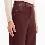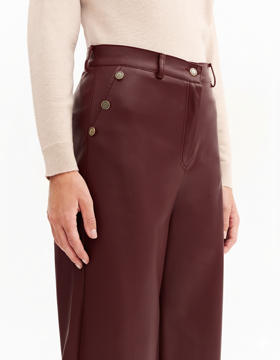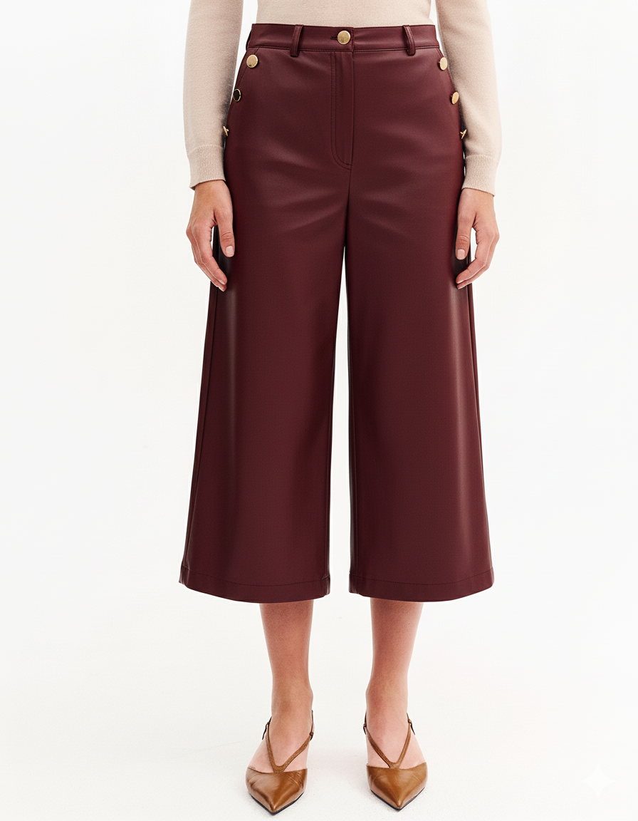 Παντελόνι από δερματίνη σε ζιπ κιλότ σχέδιο. Με θηλιές για ζώνη και κλείσιμο μπροστά με φερμουάρ και κουμπί. Λεπτομέρεια χρυσά διακοσμητικά κουμπιά.