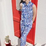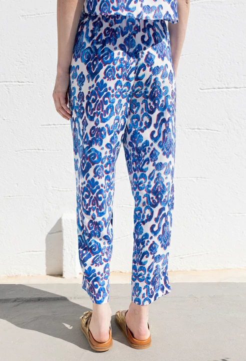 Ψηλόμεσο παντελόνι εμπριμέ με λάστιχο στη μέση, τσέπες στο πλάι, κλείσιμο μπροστά με φερμουάρ και κουμπί, κανονική εφαρμογή.