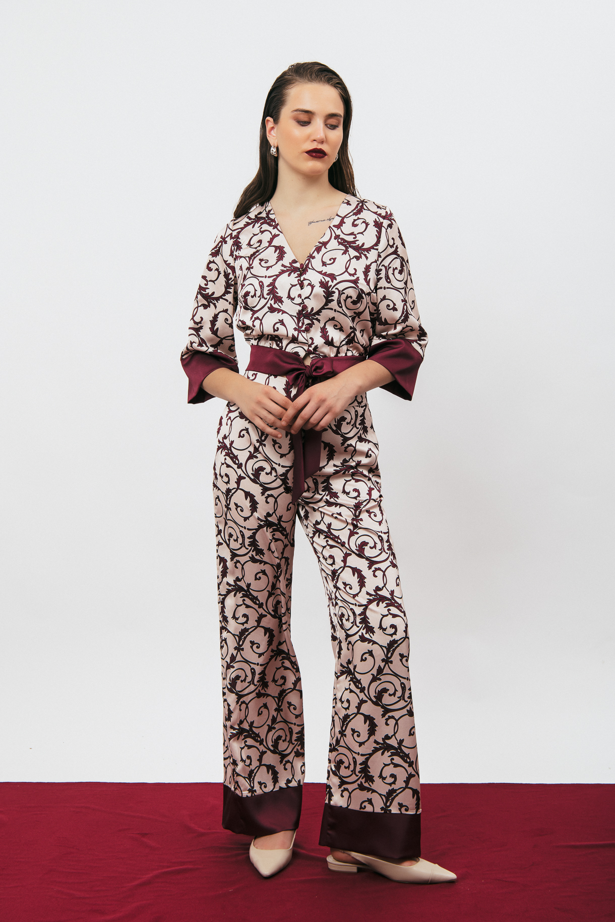 Παντελόνι με μπορντό λεπτομέρειες, Miletus” ελληνικής κατασκευής. Κατασκευασμένο από σατέν ύφασμα. Διαθέτει δύο πλαϊνές τσέπες, λάστιχο στο πίσω μέρος και κουμπώνει με φερμουάρ στο πλάι.