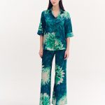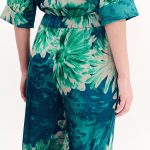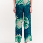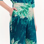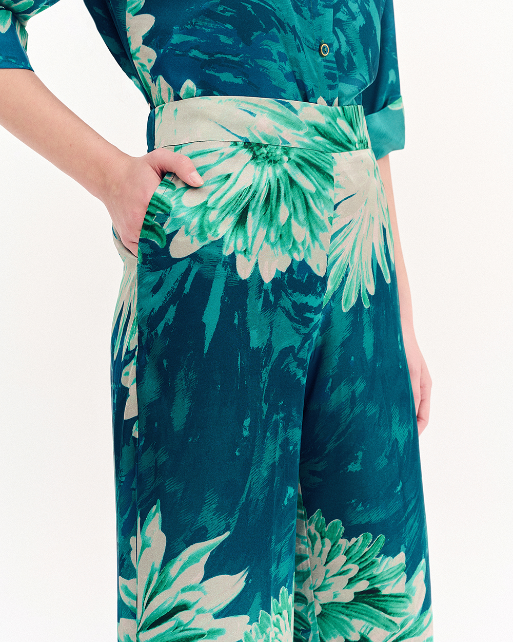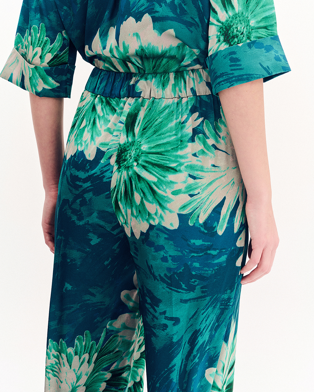 Παντελόνι φαρδύ floral σε satin ύφασμα. Κοφτή τσέπη και ελαστική μέση στο πίσω μέρος.