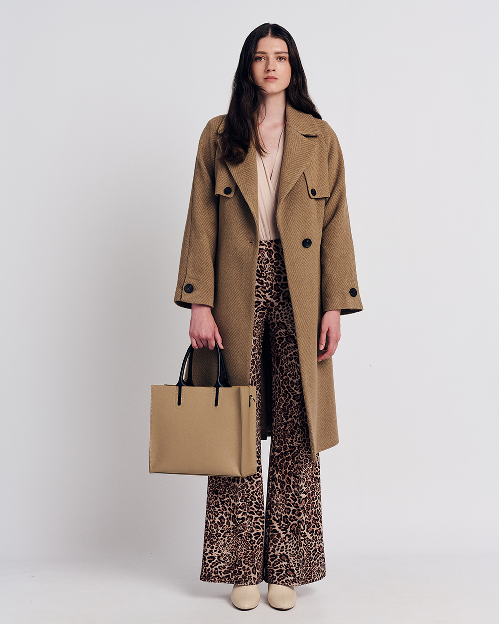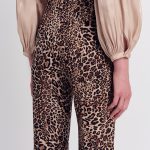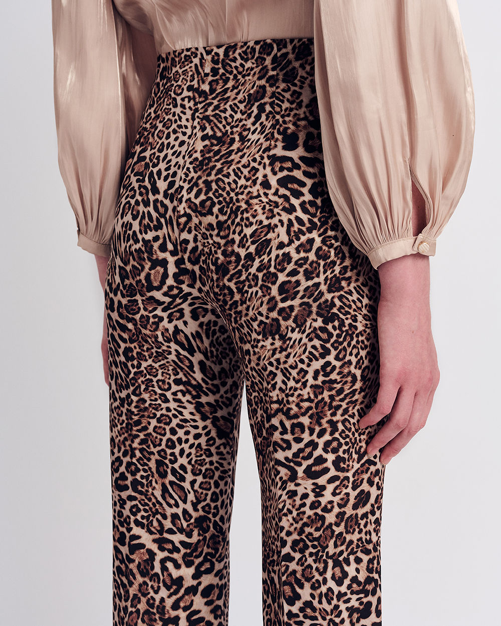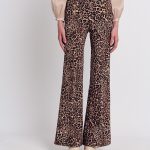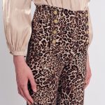Παντελόνι καμπάνα σε animal print. Λεπτομέρεια, διακοσμητικά χρυσά κουμπιά στο μπροστινό μέρος. Κλείσιμο με κρυφό φερμουάρ στο πλάι.