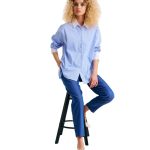 Παντελόνι τύπου τζιν, στενό με μείγμα από ύφασμα βισκόζη. Λάστιχο στο πίσω μέρος. Λεπτομέρεια, διακοσμητικό λεπτό ζωνάκι από το ίδιο ύφασμα