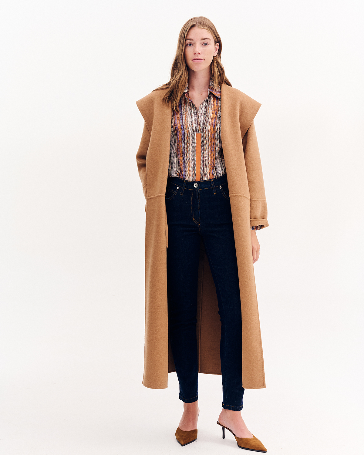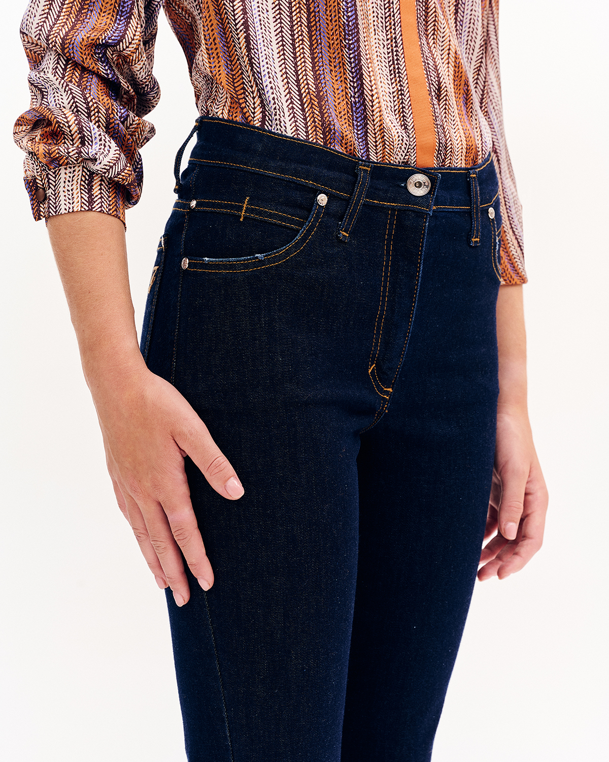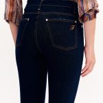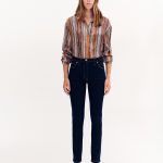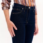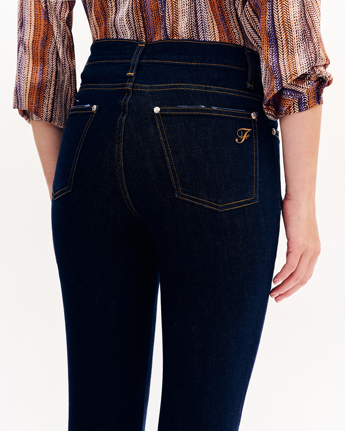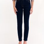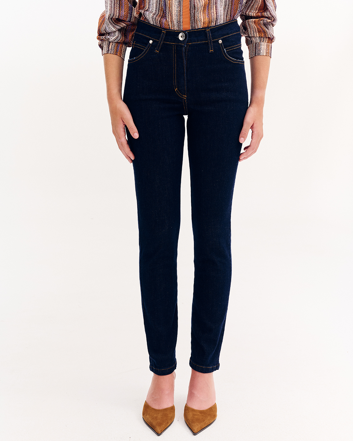 Παντελόνι τζιν σε στενή γραμμή. Με κοφτές τσέπες μπροστά, τετράγωνες πίσω και θηλιές για ζώνη. Κλείσιμο με φερμουάρ και κουμπί.