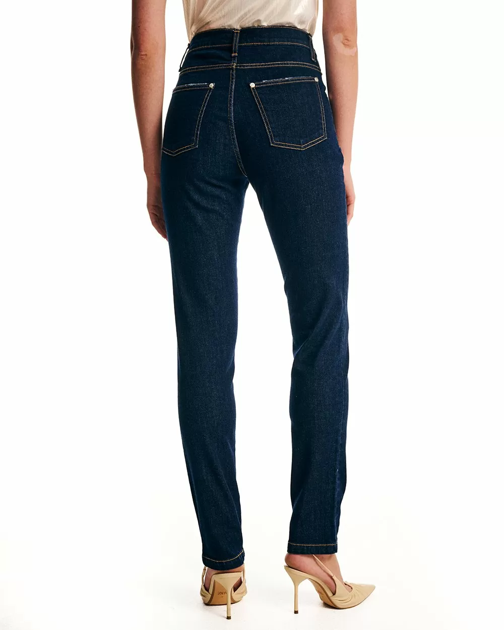 Παντελόνι τζιν πεντάτσεπο σε ελαστικό βαμβακερό ύφασμα. Γραμμή στενή. Κλείσιμο μπροστά με φερμουάρ και μεταλλικό κουμπί.