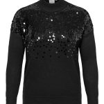 Πλεκτό πουλόβερ με παγιετες στο πάνω μέρος και ψηλο λαιμο, Μανσέτες με ραβδώσεις .