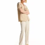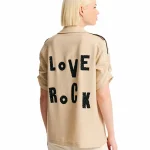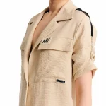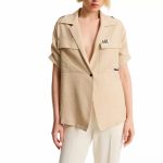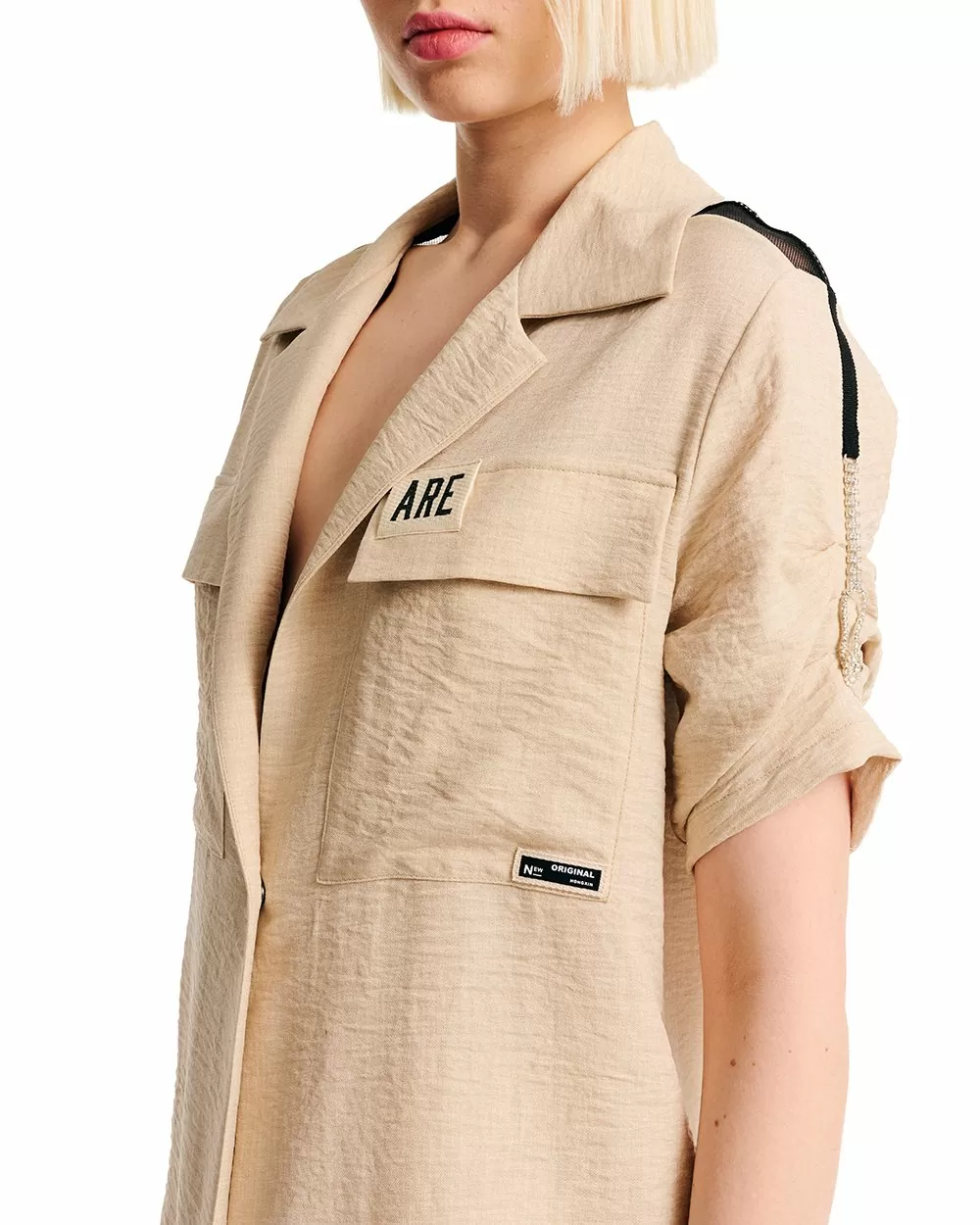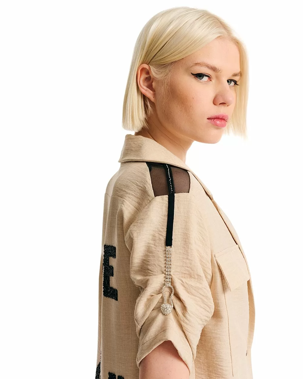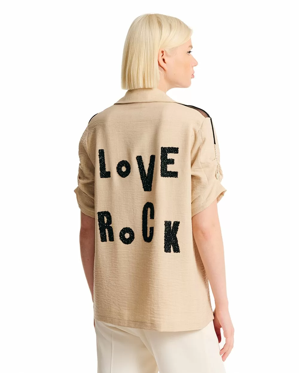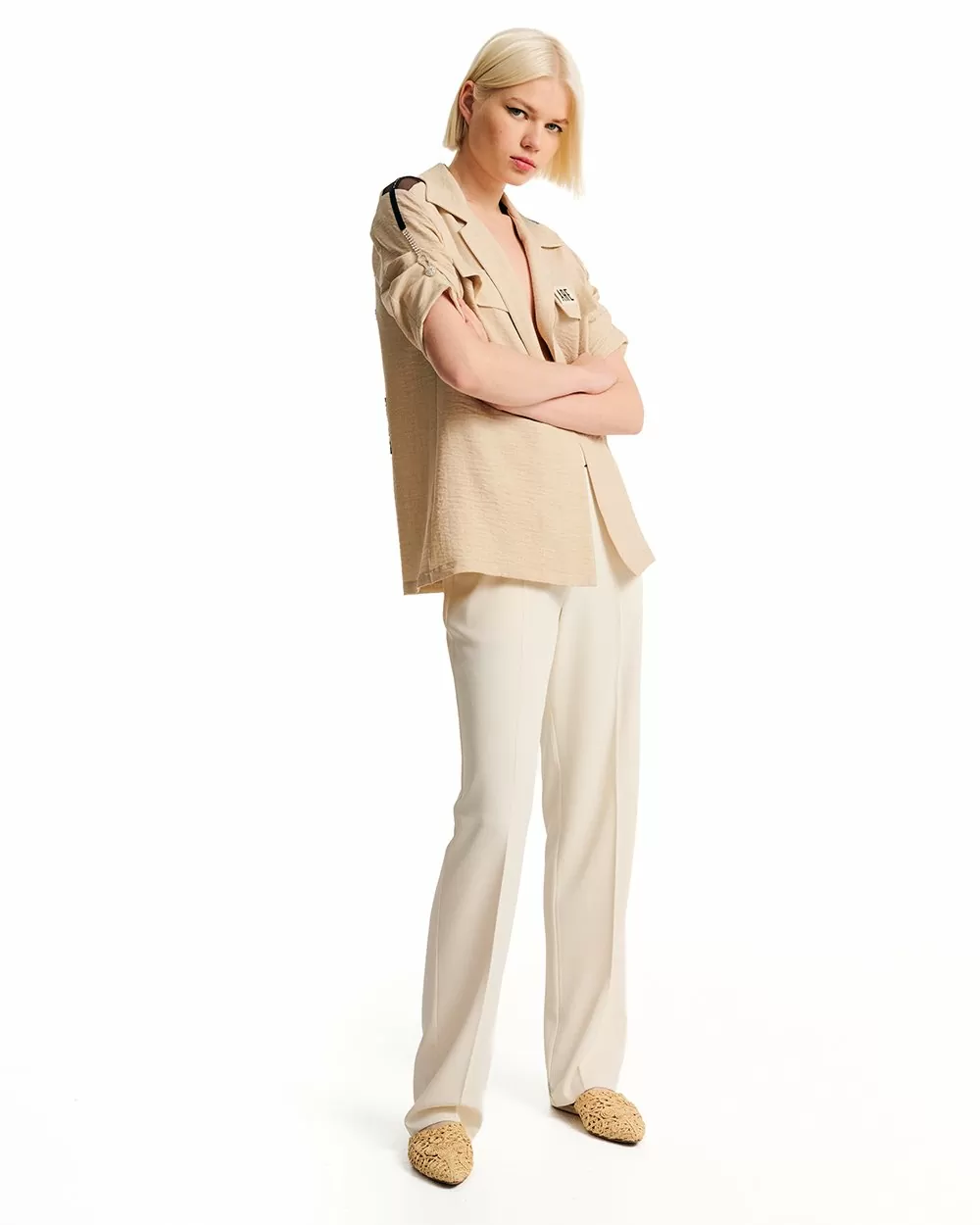 Πουκάμισο σε στυλ safari σε ανάλαφρο ύφασμα. Γιακάς με πέτο. Τετράγωνες τσέπες. Μανίκι 3/4 και πιάσιμο από αγκράφα με strass. Λεπτομέρεια, διαφάνεια στους ώμους και διακοσμητικές χάντρες στην πλάτη. Κλείσιμο μπροστά με ένα κουμπί.