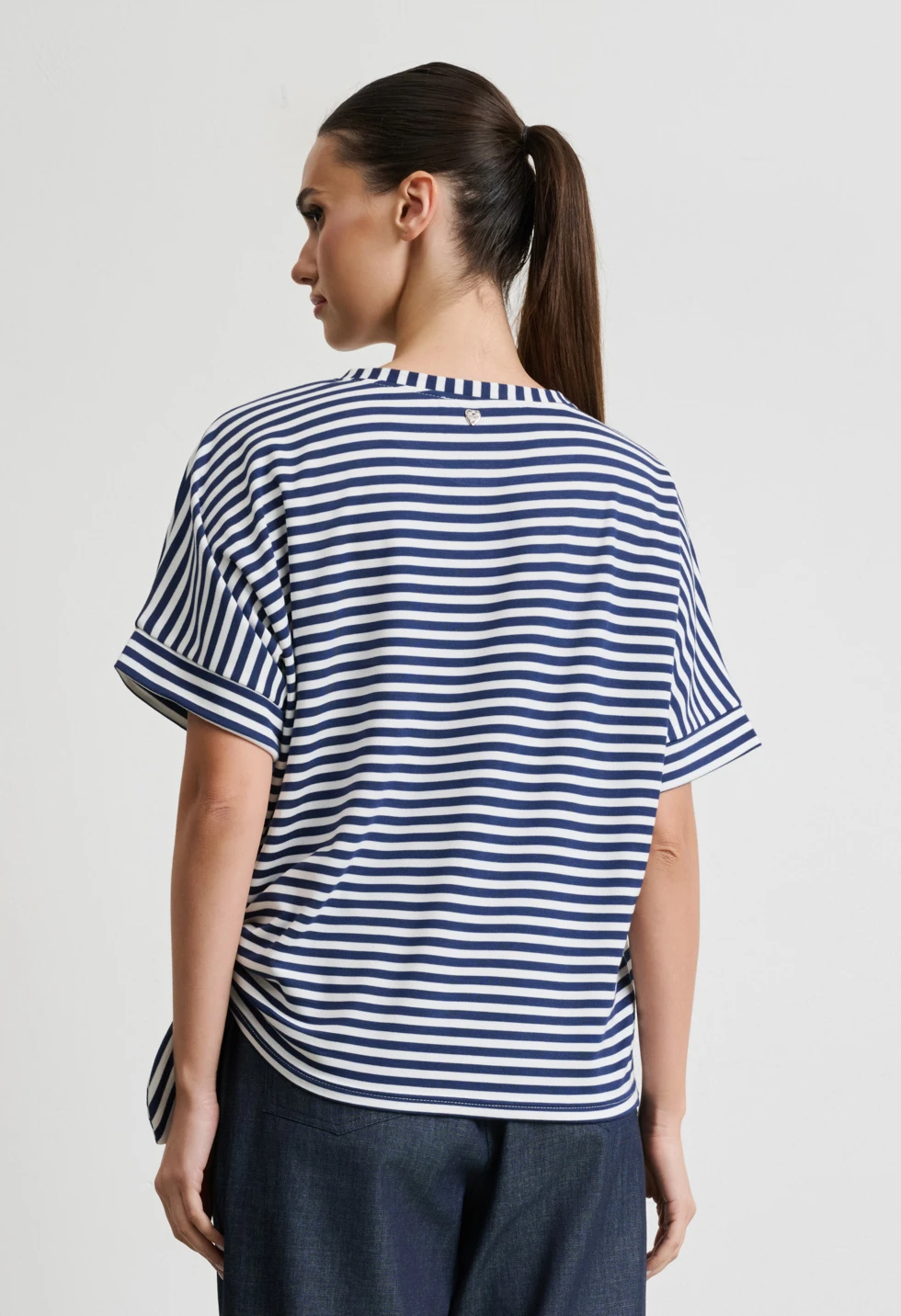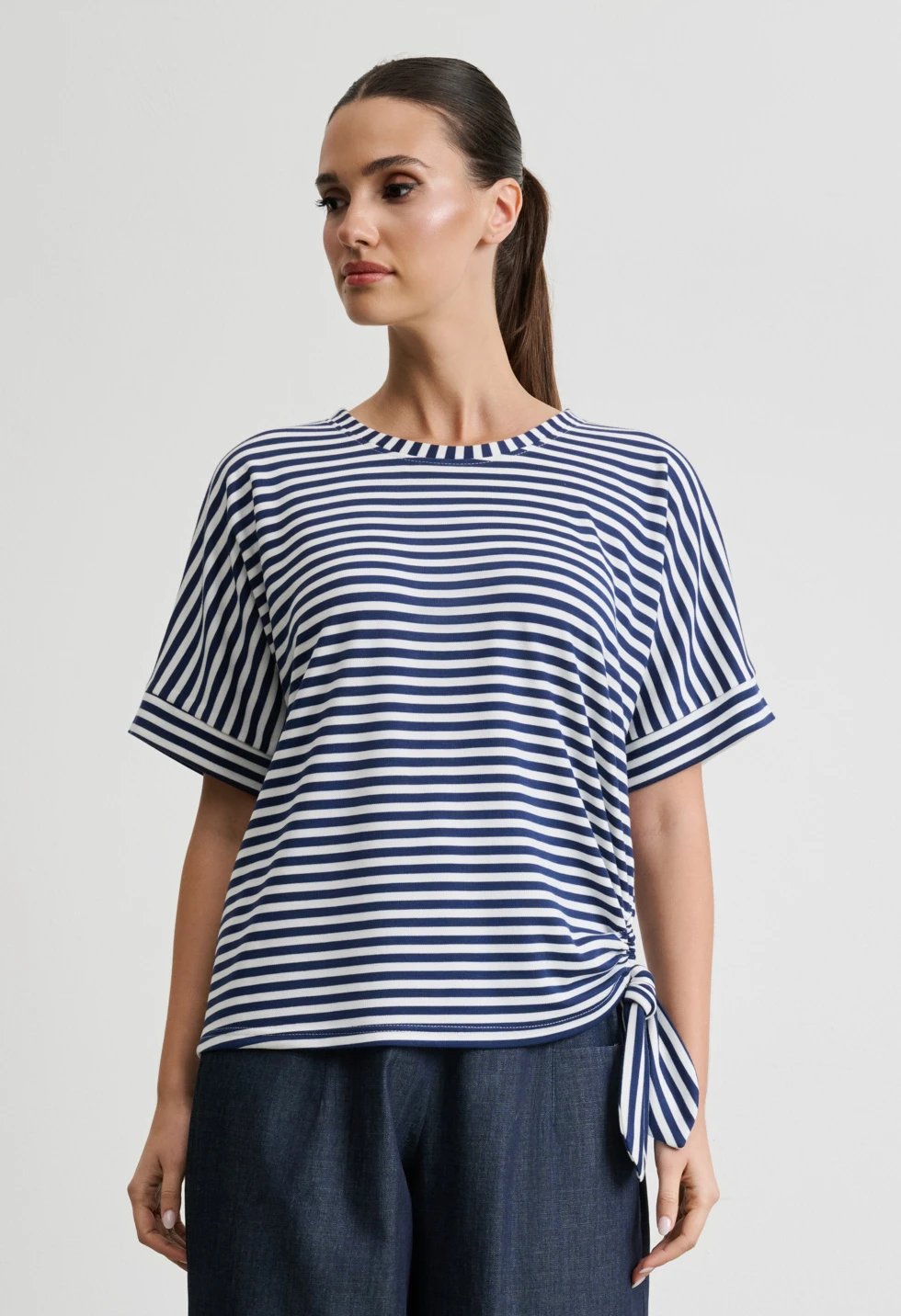 Ριγέ μπλούζα με άνετη, χαλαρή γραμμή που προσφέρει ευκολία και σύγχρονο στυλ. Διαθέτει κοντό μανίκι με ρεβέρ και στρογγυλή λαιμόκοψη, ιδανική για καθημερινή χρήση. Η ξεχωριστή πλαϊνή λεπτομέρεια με δέση στο τελείωμα προσθέτει θηλυκό χαρακτήρα και δίνει τη δυνατότητα ρύθμισης της εφαρμογής. Ένα ευέλικτο κομμάτι που συνδυάζεται εύκολα με τζιν, παντελόνια ή σορτς και αποτελεί ιδανική επιλογή για casual και smart casual εμφανίσεις.