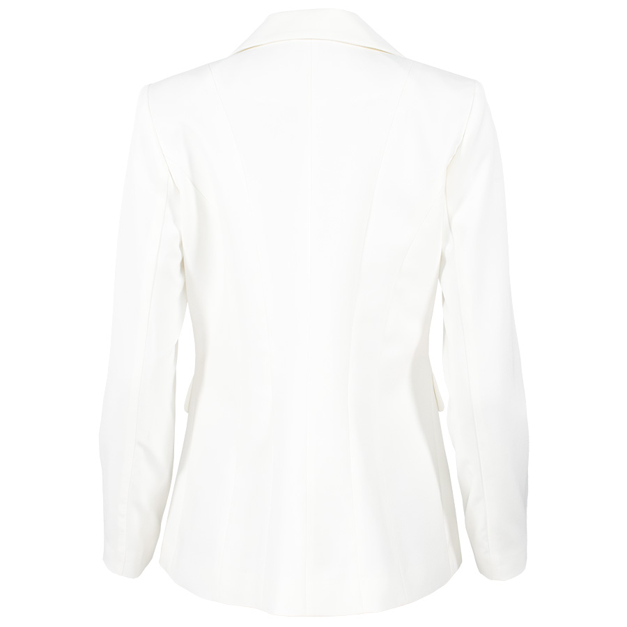 Σακάκι με γιακά πέτο και μακριά μανίκια με βάτες. Λεπτομέρεια, διακοσμητικά χρυσά κουμπιά και εφαρμοστή μέση με τονισμένα γαζιά. Μπροστινές τσέπες πατ με καπάκι. Κλείσιμο μπροστά με κουμπί.