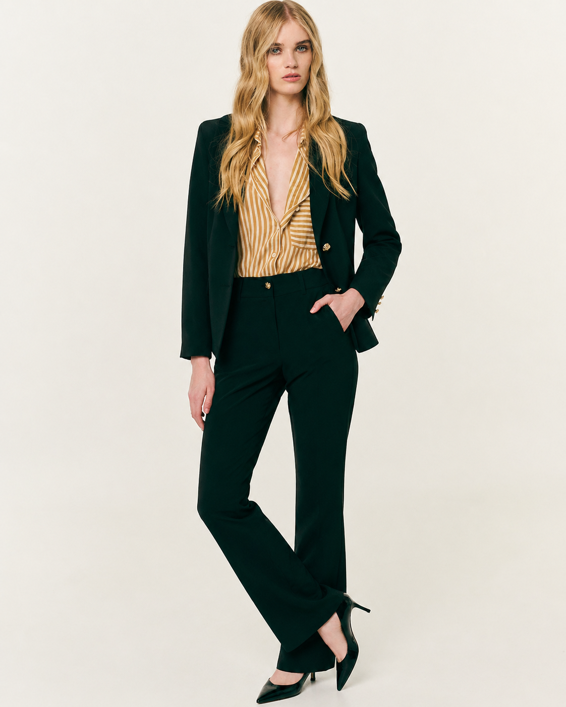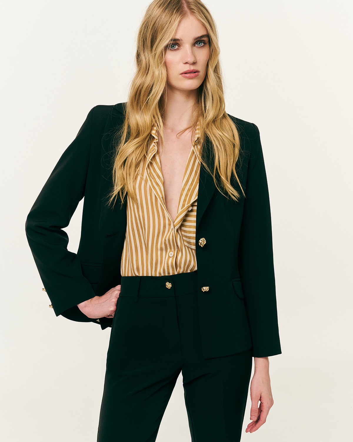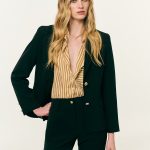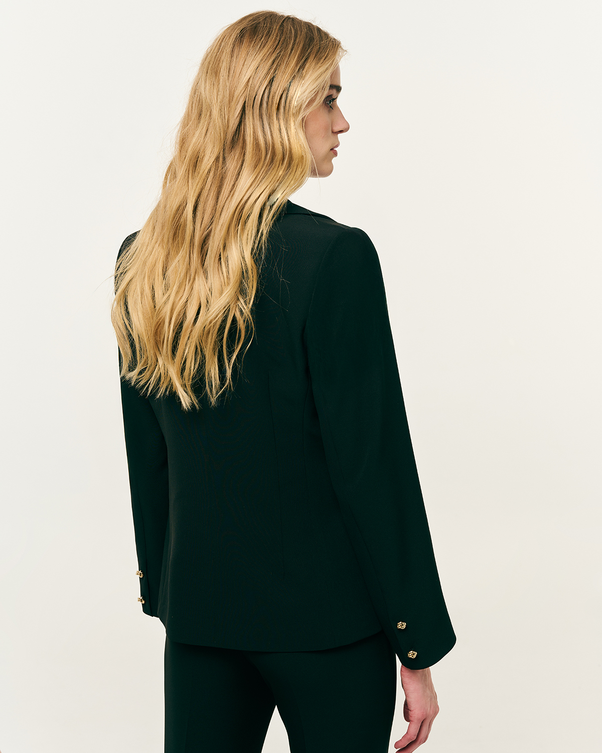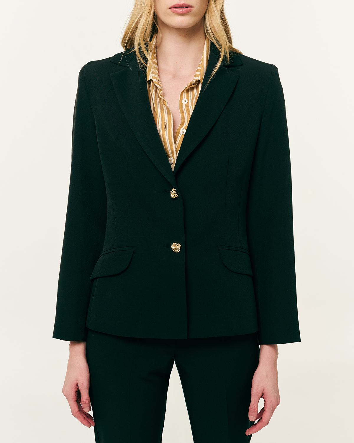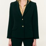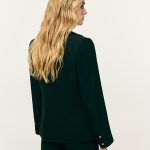 Σακάκι μεσάτο κρεπ. Γιακάς με πέτο. Βάτες και μακρύ μανίκι. Τσέπες με καπάκι και κλείσιμο μπροστά με κουμπιά.