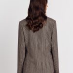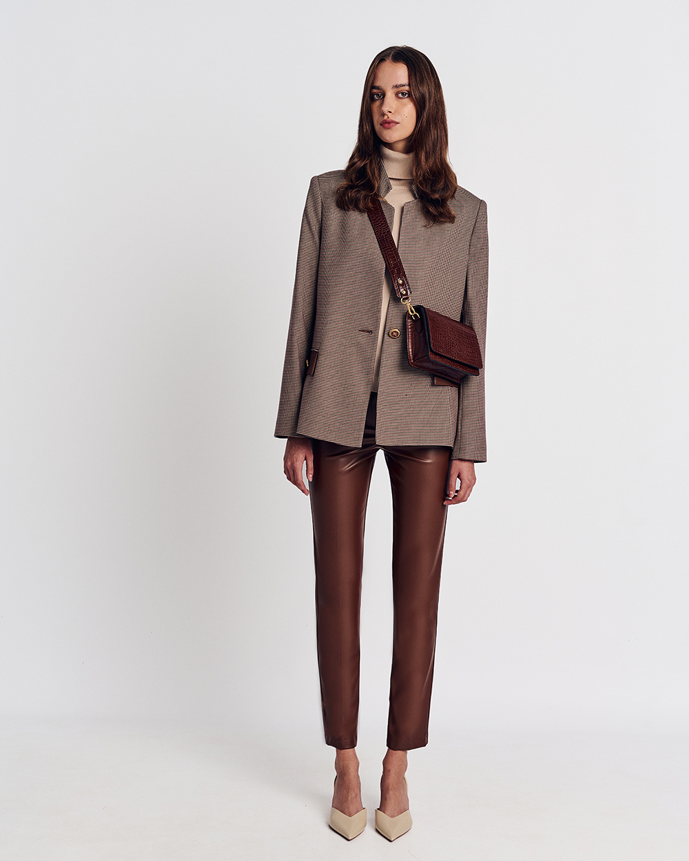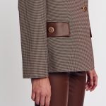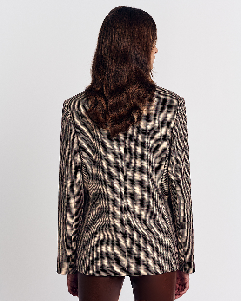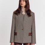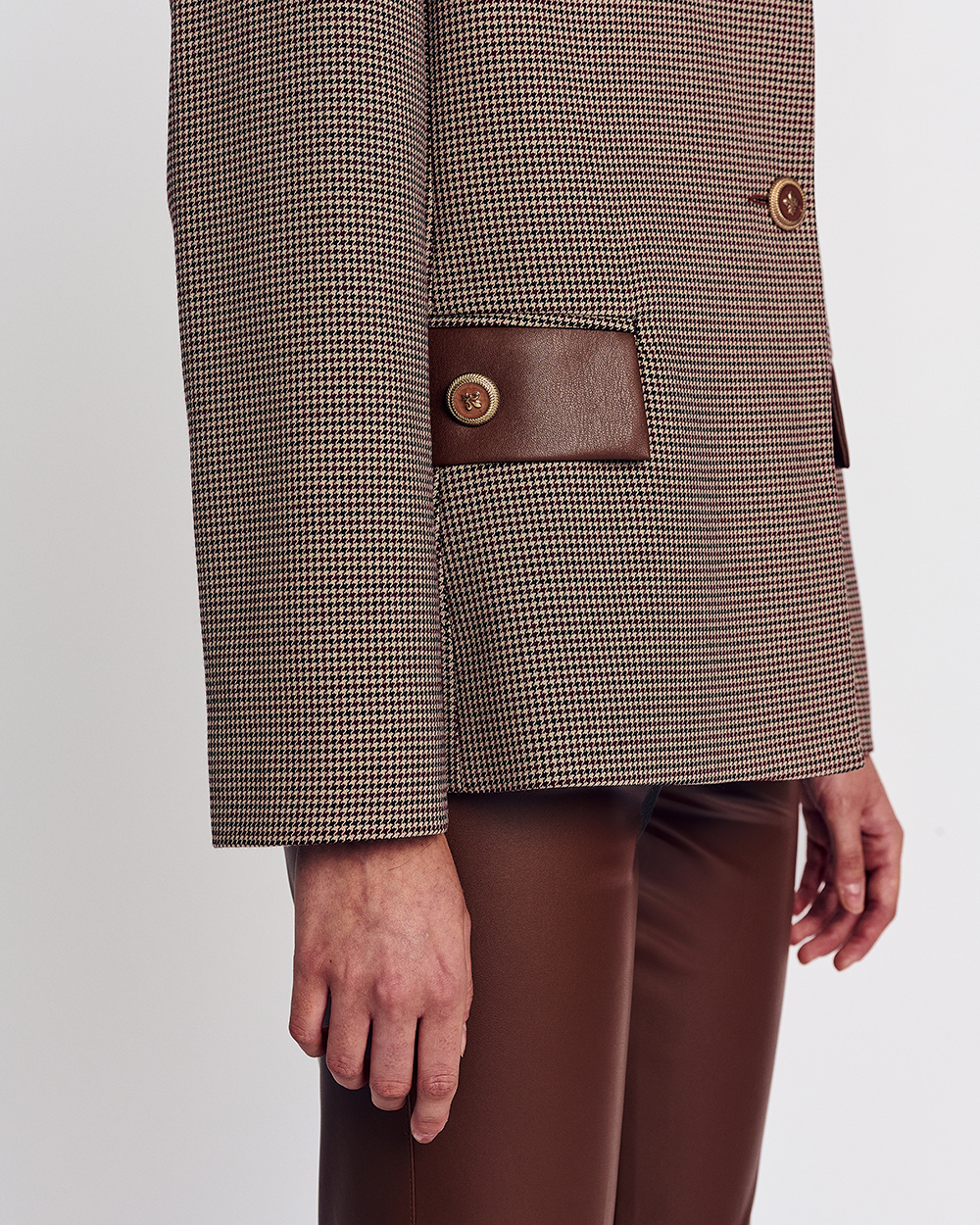 Σακάκι μεσάτο σε pied de poule ύφασμα με mao γιακά. Λεπτομέρεια, ιδιαίτερα διακοσμητικά κουμπιά και πατ τσέπες δερματίνη. Κλείσιμο με κουμπί μπροστά.