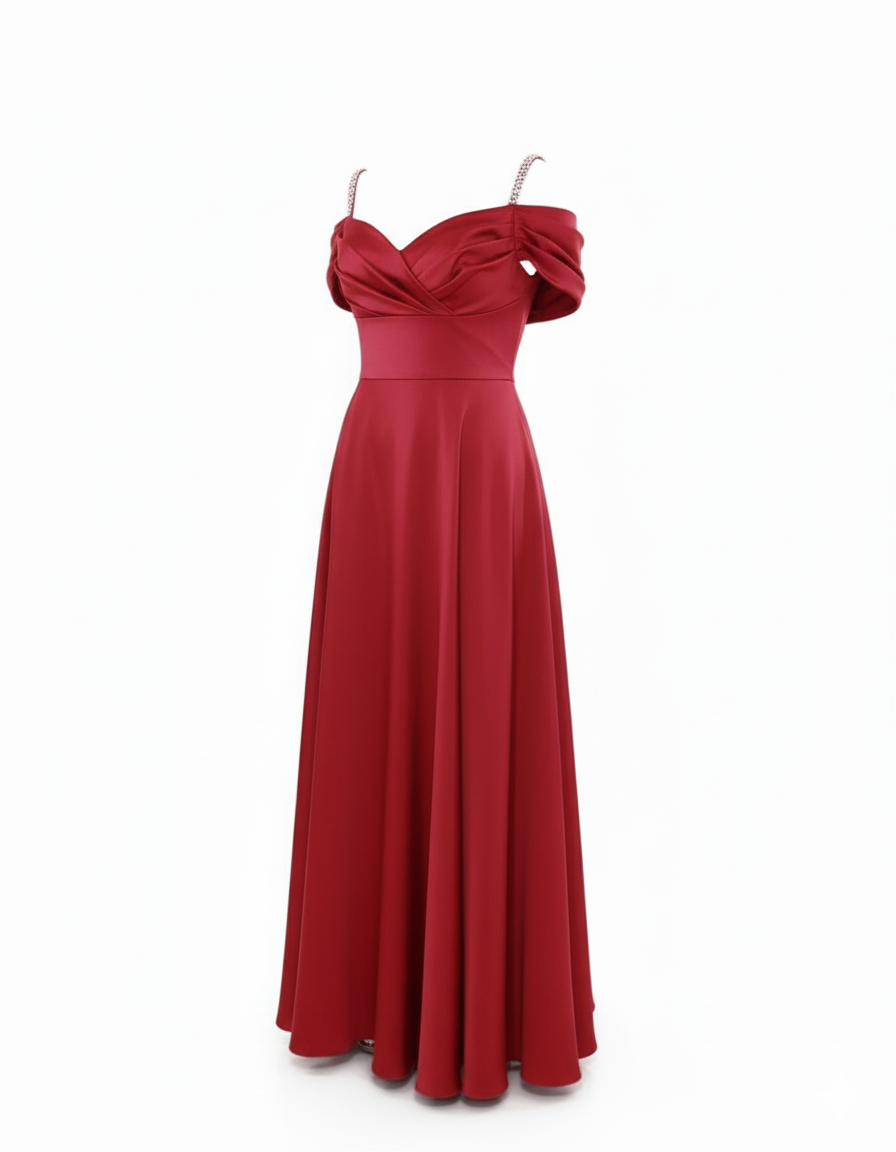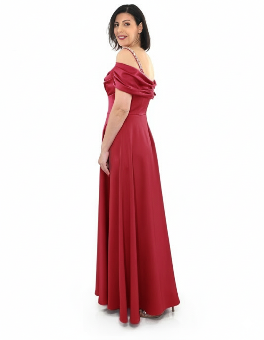 Ένα εντυπωσιακό κοκκινο μαξι φόρεμα από σατέν ύφασμα που αποπνέει κομψότητα και θηλυκότητα. Οι γυμνοί ώμοι και οι λαμπερές, κεντητές τιράντες χαρίζουν λάμψη και στυλ, ενώ η άνετη γραμμή σε Α σιλουέτα αγκαλιάζει το σώμα με χάρη. Ιδανική επιλογή για cocktail βραδιές, γάμους ή εορταστικά events.