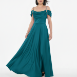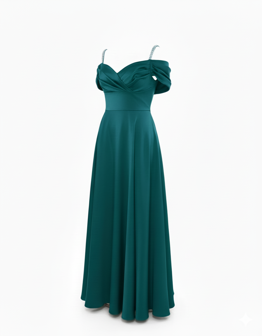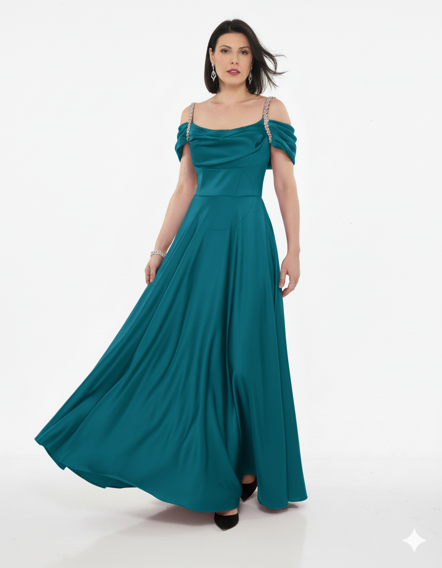 Ένα εντυπωσιακό πετρολ μαξι φόρεμα από σατέν ύφασμα που αποπνέει κομψότητα και θηλυκότητα. Οι γυμνοί ώμοι και οι λαμπερές, κεντητές τιράντες χαρίζουν λάμψη και στυλ, ενώ η άνετη γραμμή σε Α σιλουέτα αγκαλιάζει το σώμα με χάρη. Ιδανική επιλογή για cocktail βραδιές, γάμους ή εορταστικά events.