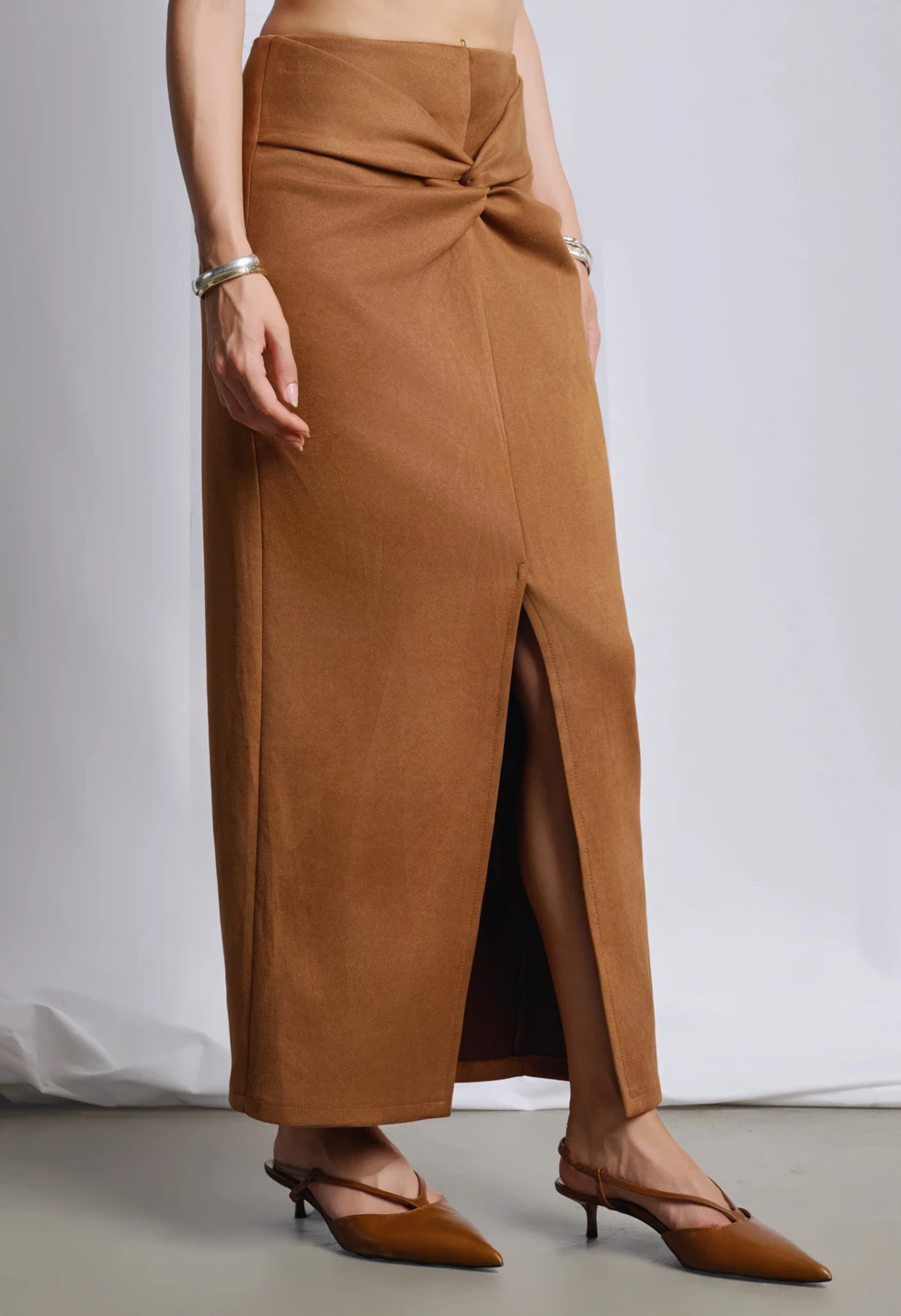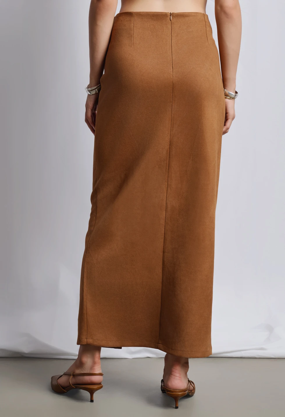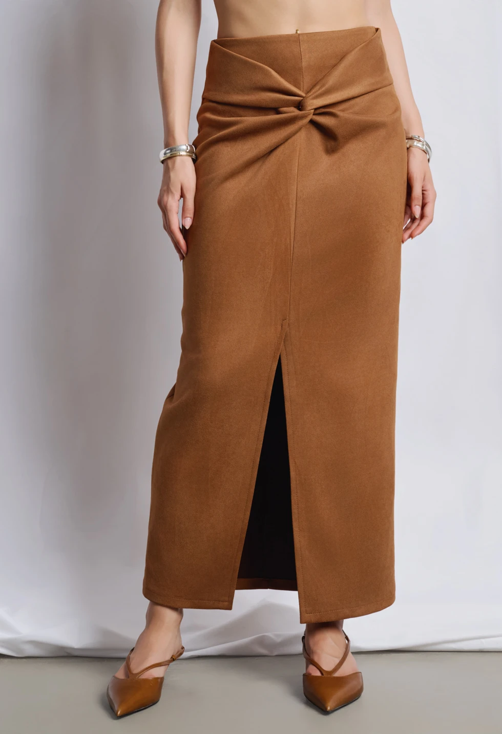 Midi φούστα από σουέτ, λεπτομέρεια με κόμπο στη μέση και σκίσιμο μπροστά, κλείσιμο με φερμουάρ στο πίσω μέρος, εφαρμοστή γραμμή. Θηλυκή και κομψή επιλογή για κάθε περίσταση.