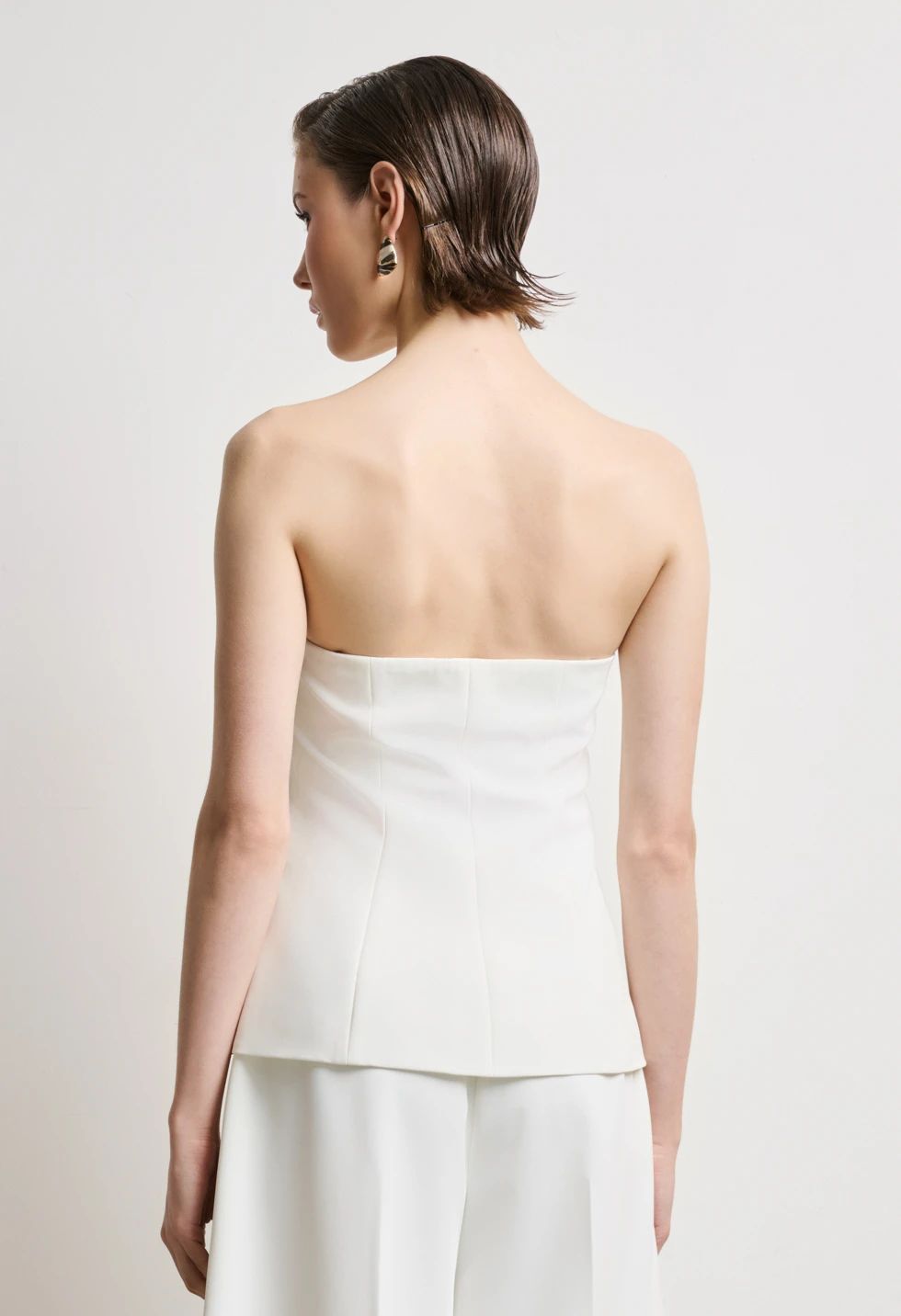 Strapless γιλέκο κοστουμιού σχεδιασμένο για elegant και σύγχρονες εμφανίσεις. Διαθέτει sweetheart λαιμόκοψη που αναδεικνύει το ντεκολτέ, κουμπιά μπροστά σε ίσια γραμμή και διακριτικές τσέπες με καπάκι για tailored αισθητική. Η εφαρμογή του είναι δομημένη, προσφέροντας άψογη σιλουέτα και σταθερό κράτημα χωρίς τιράντες. Φοριέται μόνο του ή ως μέρος κοστουμιού με παντελόνι ή φούστα.
