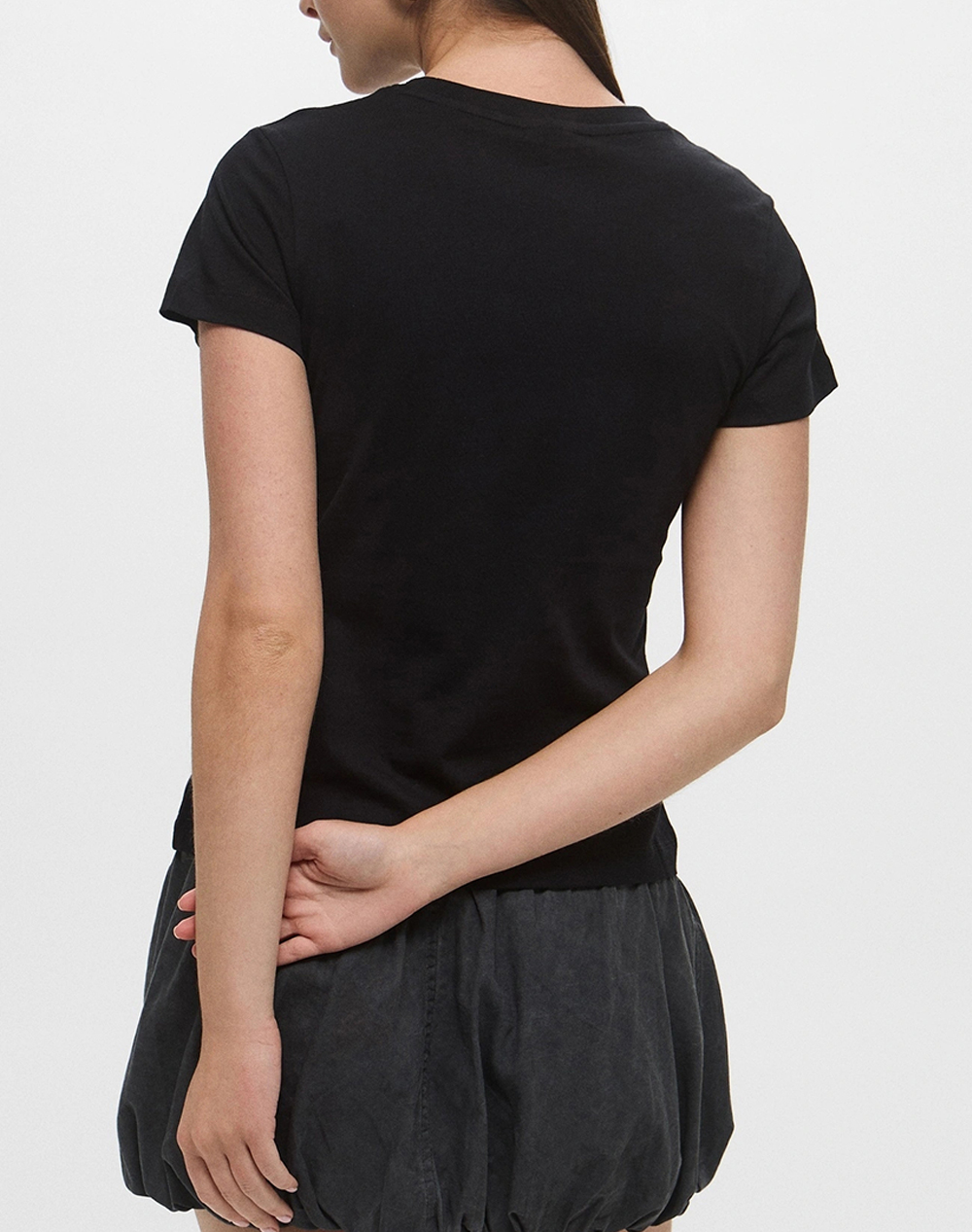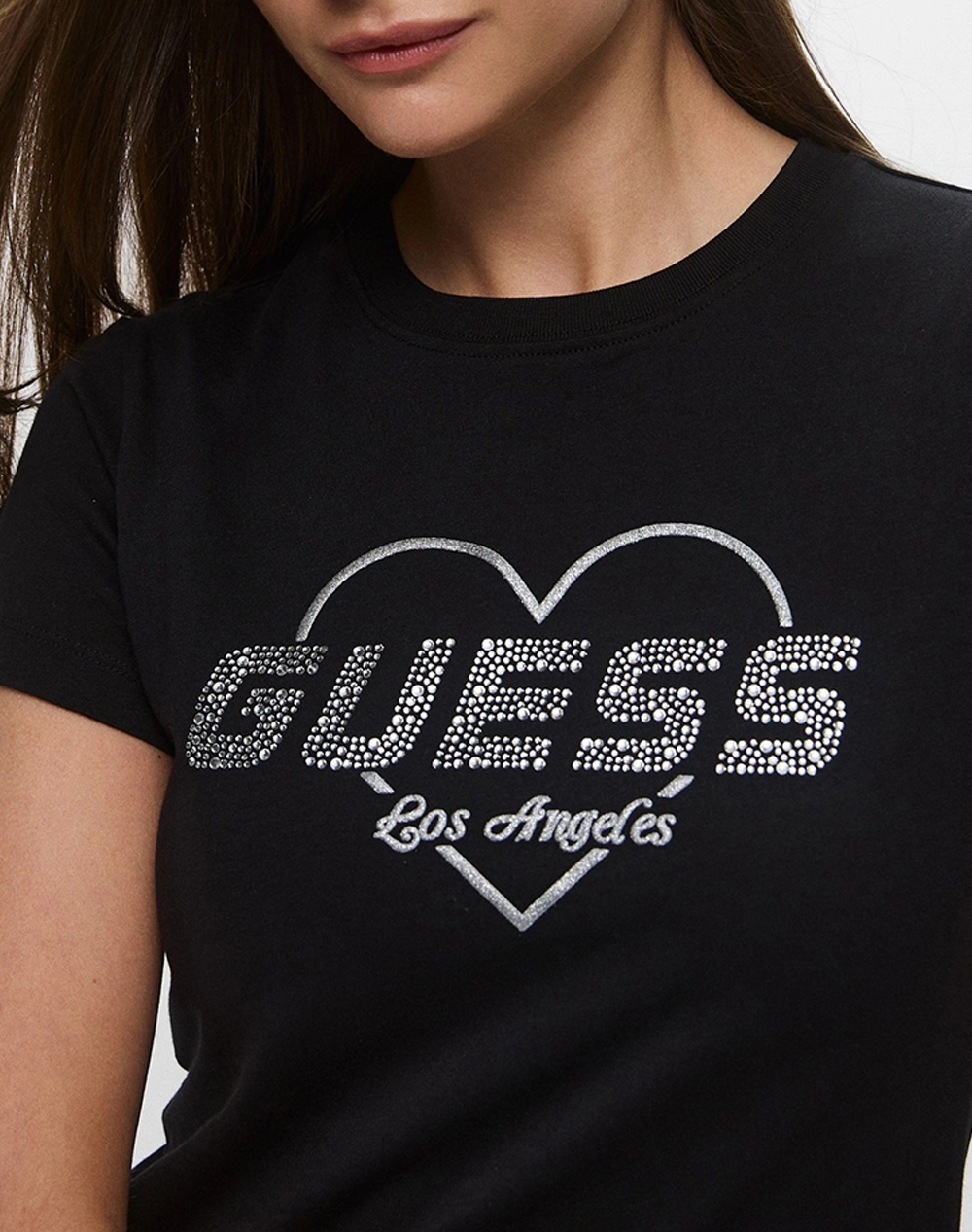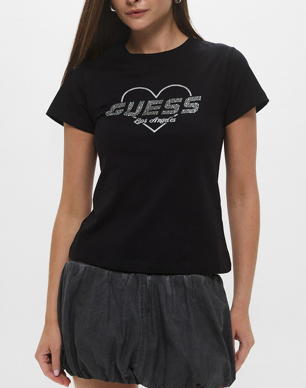 Γυναικείο t-shirt, σε κανονική γραμμή, κοντομάνικο, με στρογγυλή λαιμόκοψη και strass λογότυπο μπροστά.