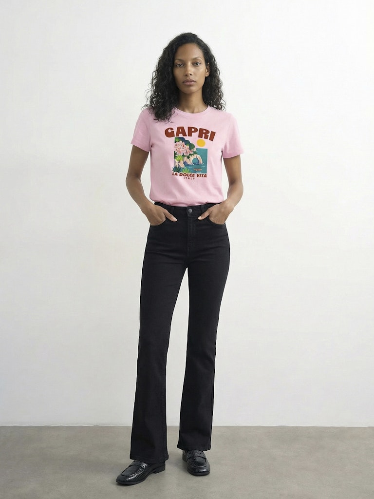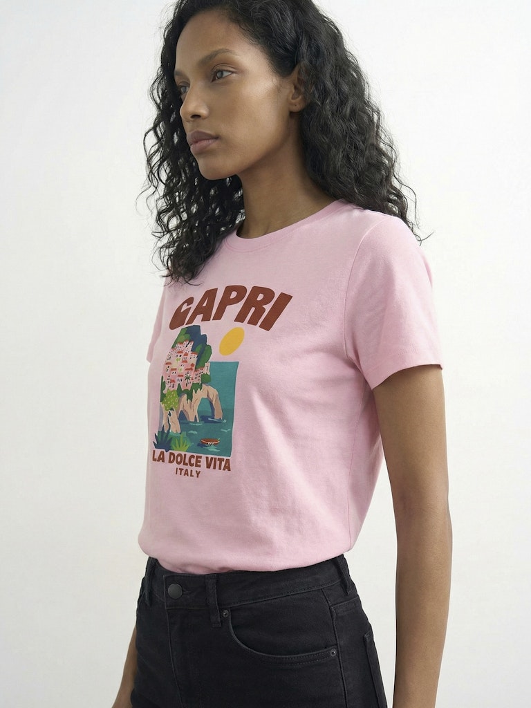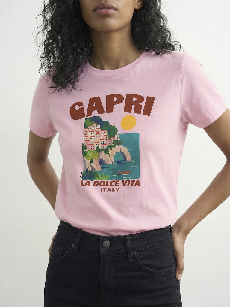 Βαμβακερό t-shirt σε ροζ απόχρωση με γραφική στάμπα εμπνευσμένη από το Capri και τη “La Dolce Vita”. Διαθέτει κλασική λαιμόκοψη και κοντά μανίκια, ενώ η relaxed εφαρμογή το καθιστά ιδανικό για άνετα καθημερινά looks.