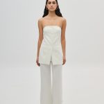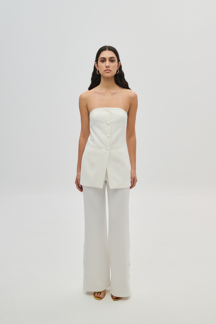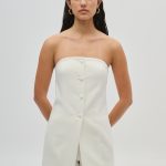 Μινιμαλιστικό strapless τοπ σε ίσια γραμμή, με επένδυση και διακοσμητικά κουμπιά μπροστά. Κομψή και μοντέρνα επιλογή για ιδιαίτερες εμφανίσεις, ιδανικό για συνδυασμούς με παντελόνι ή φούστα.
