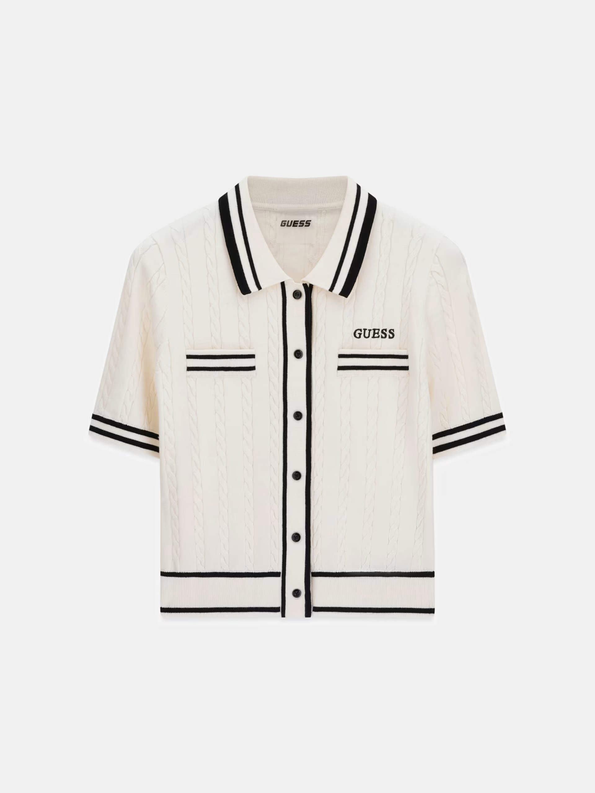 Cable knit cardigan.Μανίκι κοντό.Ζιβάγκο.Κλείσιμο με κουμπιά.Πλεκτή πλεξούδα.Κεντημένο λογότυπο.